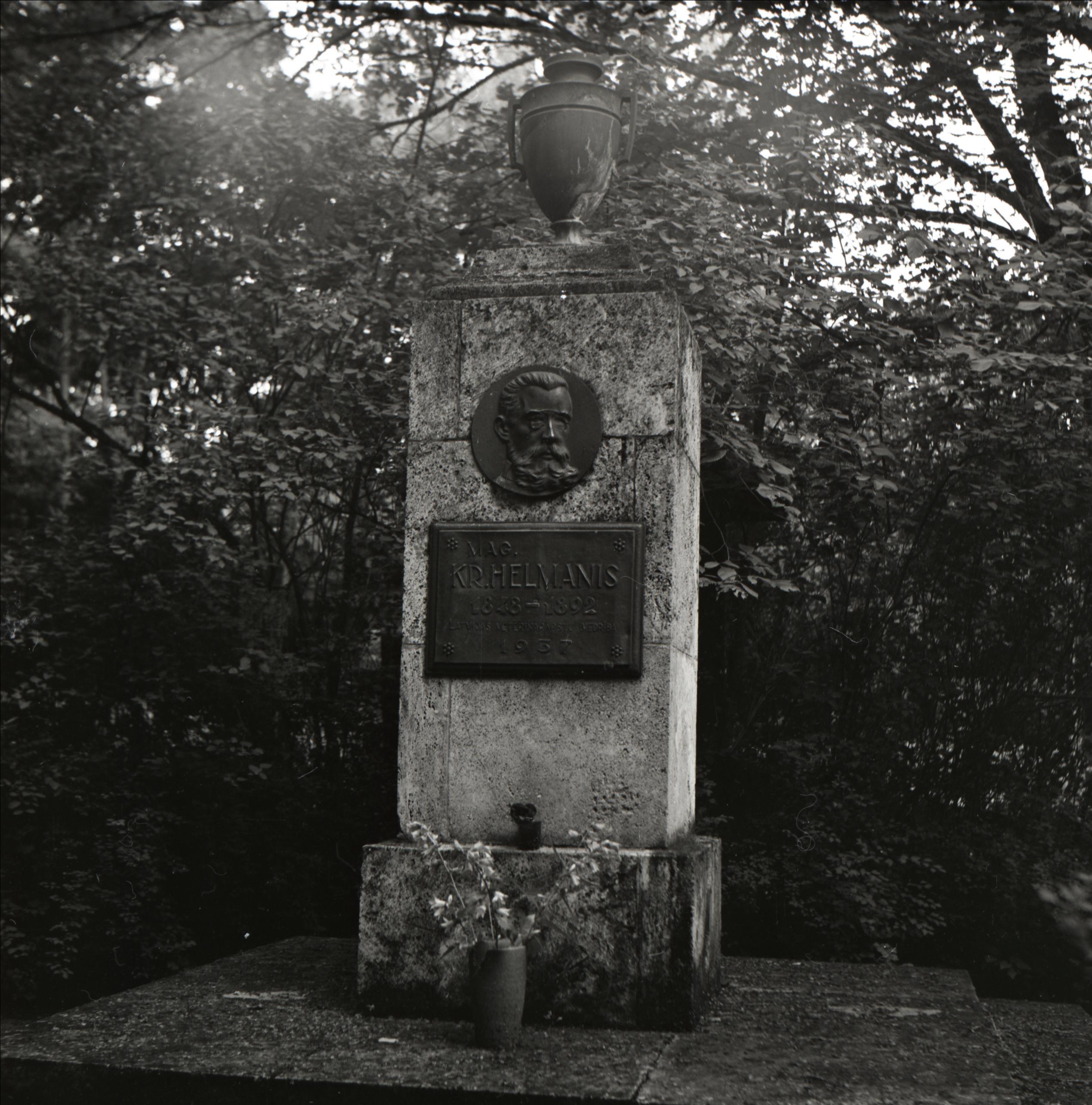 Kristapa Helmaņa kaps: Piemineklis, tā augšā urna, vidū Helmaņa portrets un piemiņas plāksne