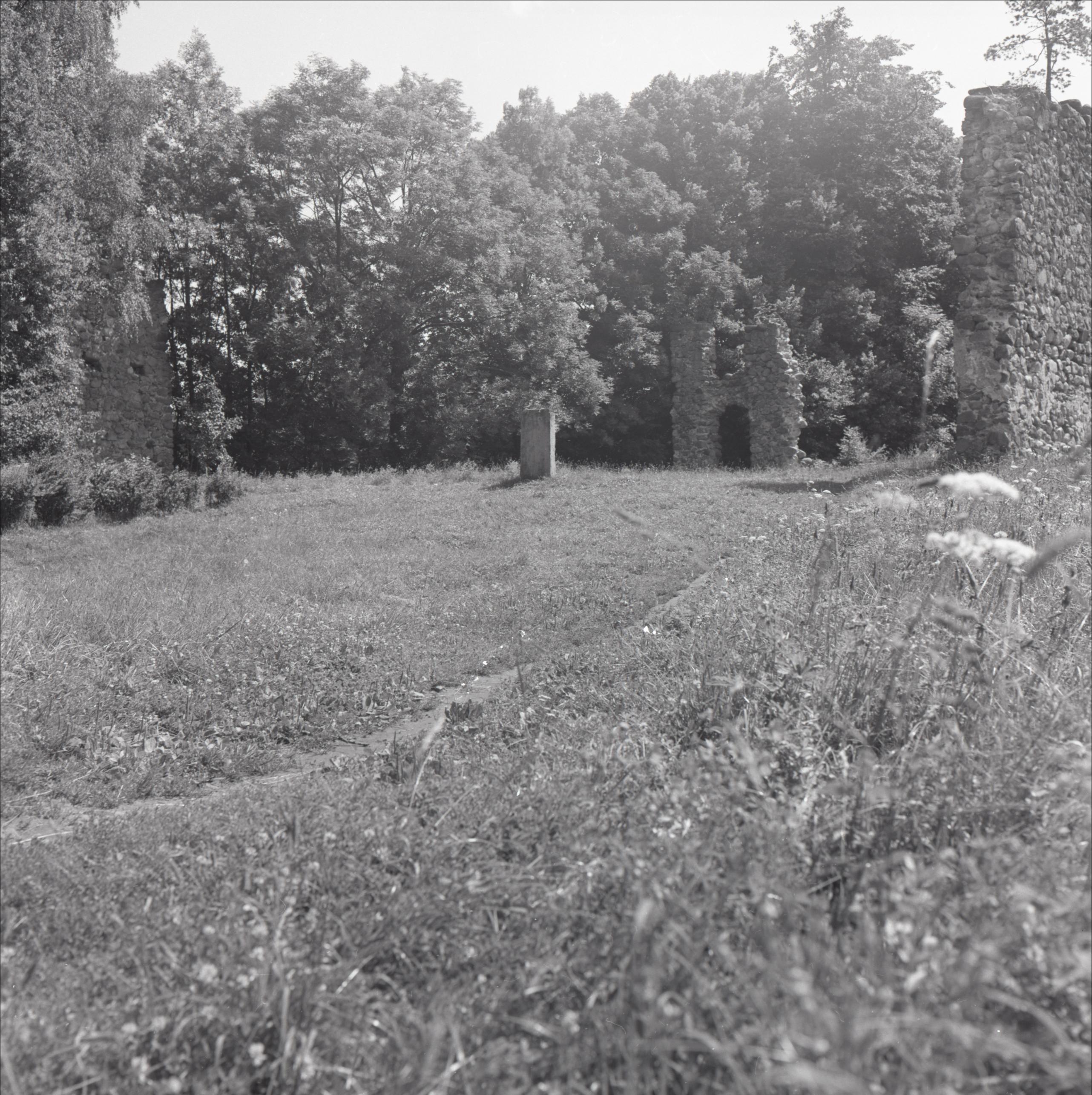 1905. gada revolucionāru piemiņas vieta pilsdrupās: Piemineklis, aiz tā apstādījumi, koki, pilsdrupas