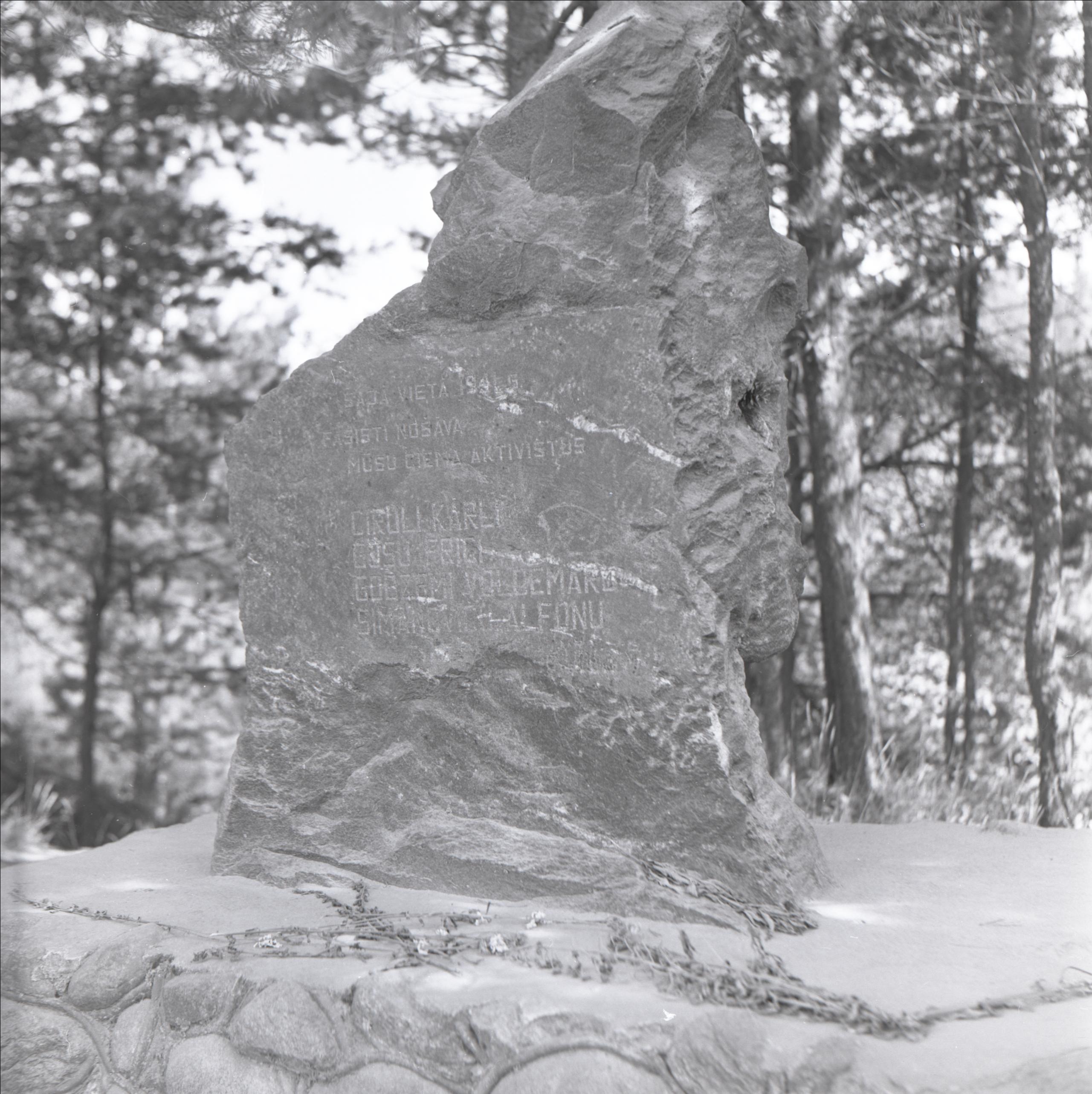 Piemineklis 1941. gadā nošautajiem aktīvistiem: Akmens stēla ar iegravētu tekstu, sniegs, fonā koki