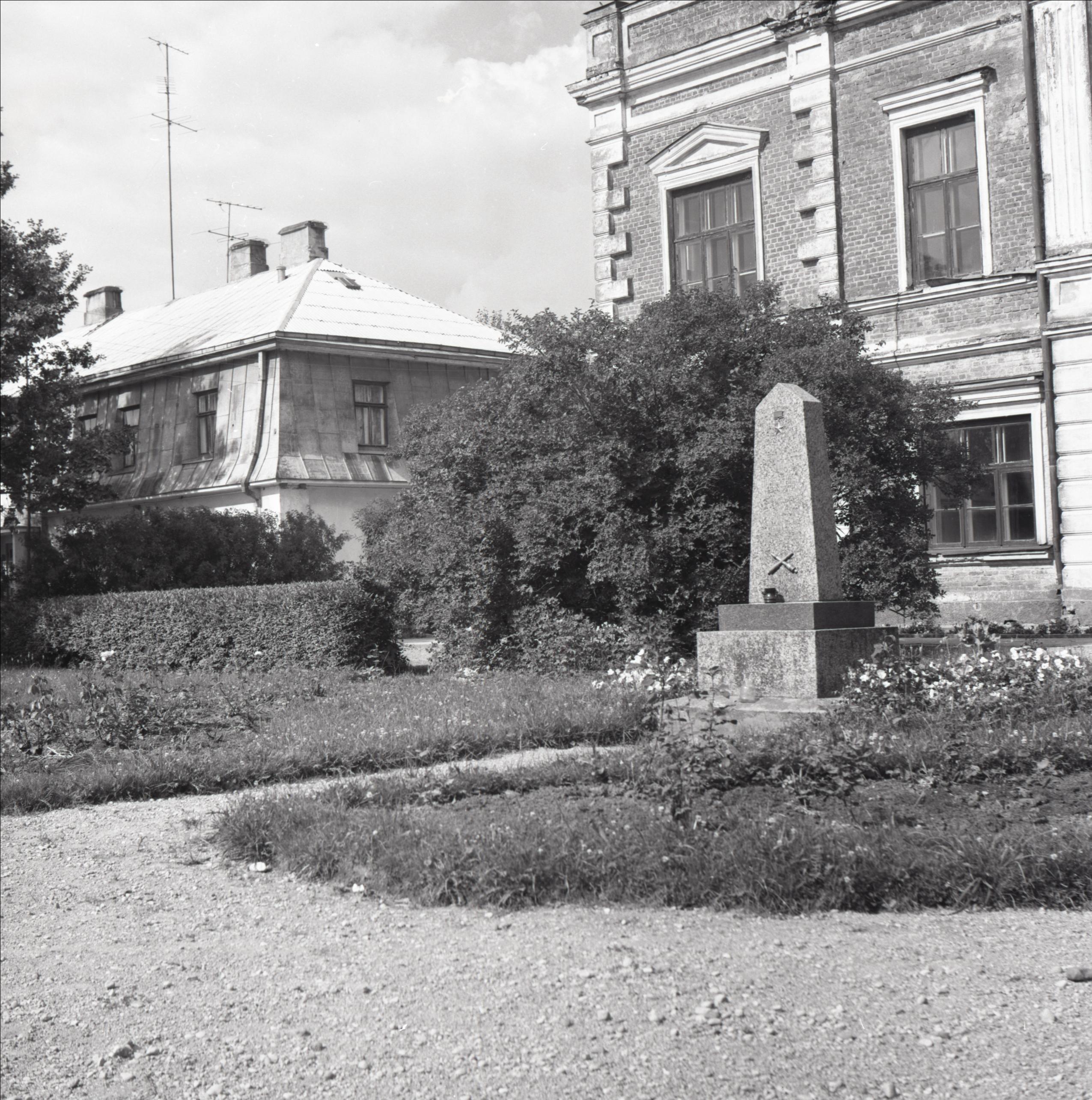 Piemineklis PSRS varonim Ivanam Novoženovam: Skats no sāniem. Piemineklis uz postamenta, fonā krūms, ēkas