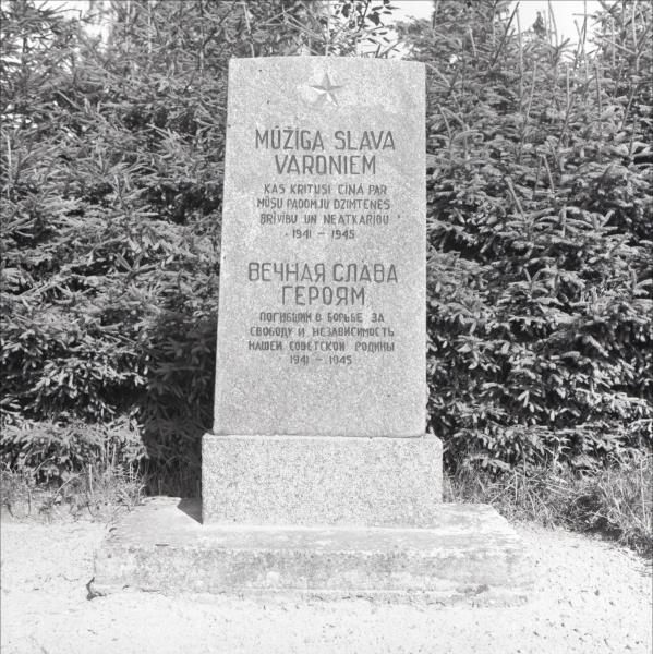 2. Pasaules karā kritušo kapi: Obelisks. Iegravēts teksts, fonā egles
