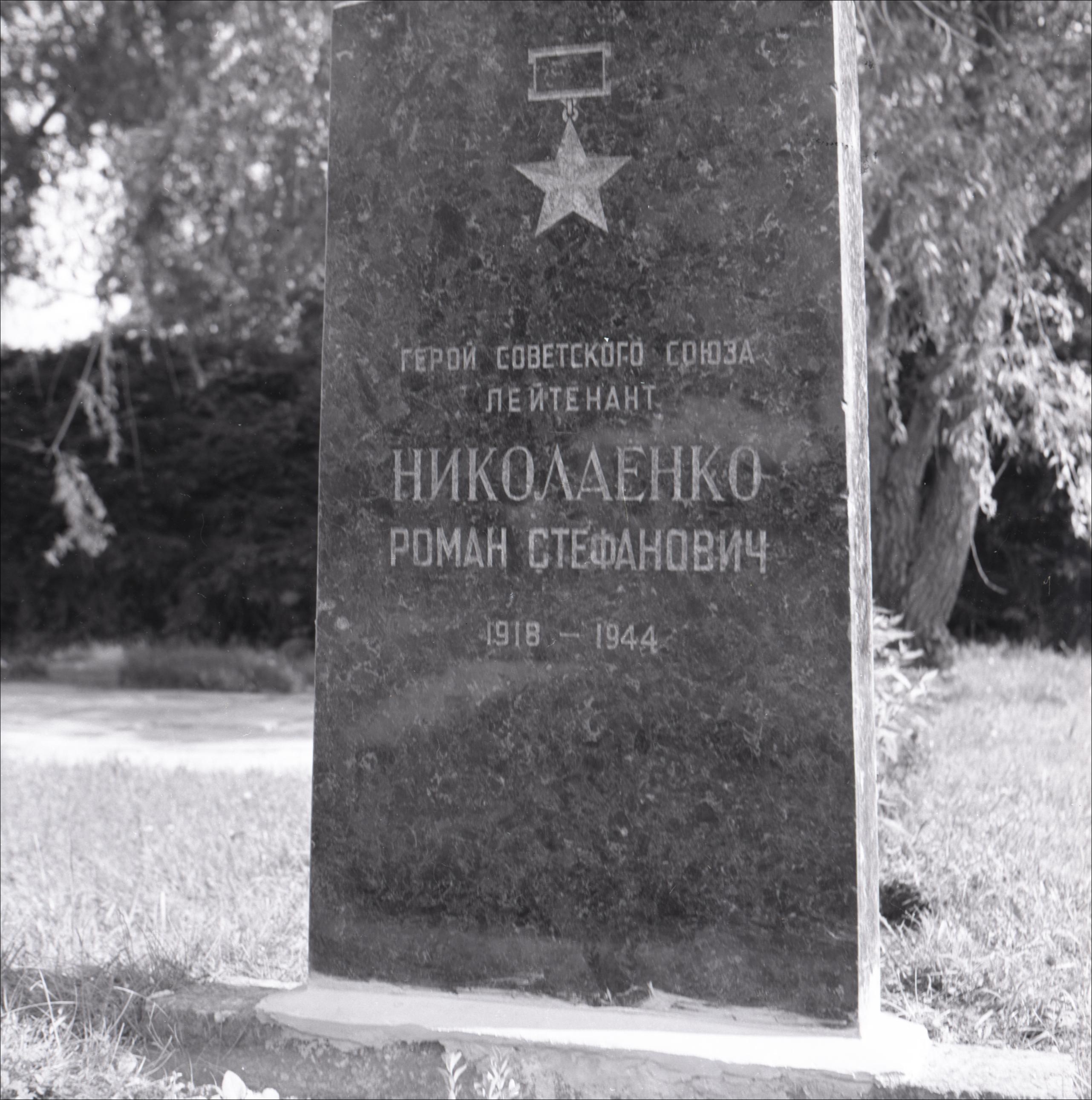 Kapa piemineklis PSRS varonim Romānam Nikolajenko: Piemineklis, uz tā iegravēts teksts, zvaigzne, fonā koki