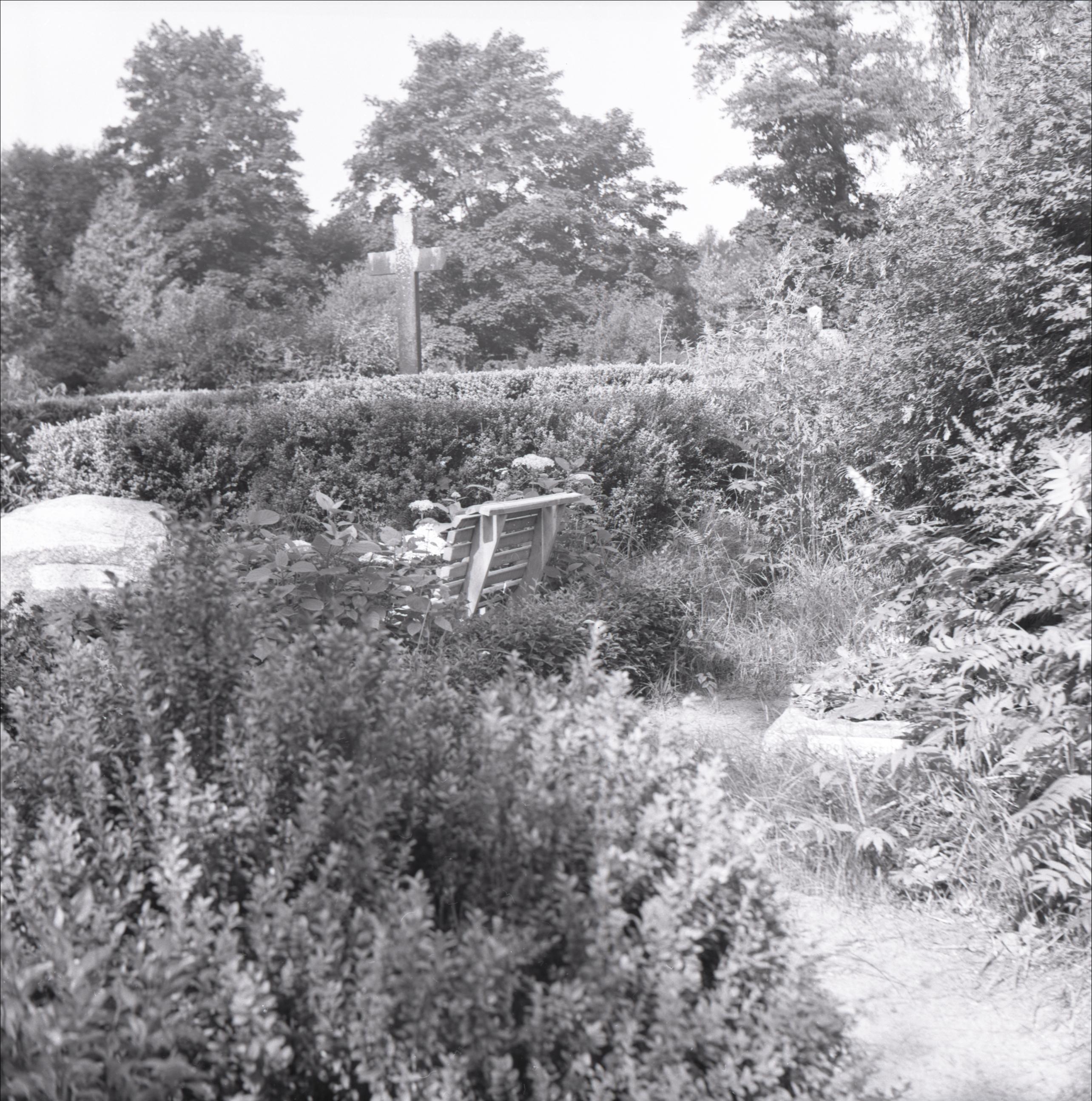 Revolucionāra Teodora Celma kaps: Kapa vieta betona rāmī, vidū apstādījumi. Redzamas citas kapa vietas, soliņš, krusts, krūmi