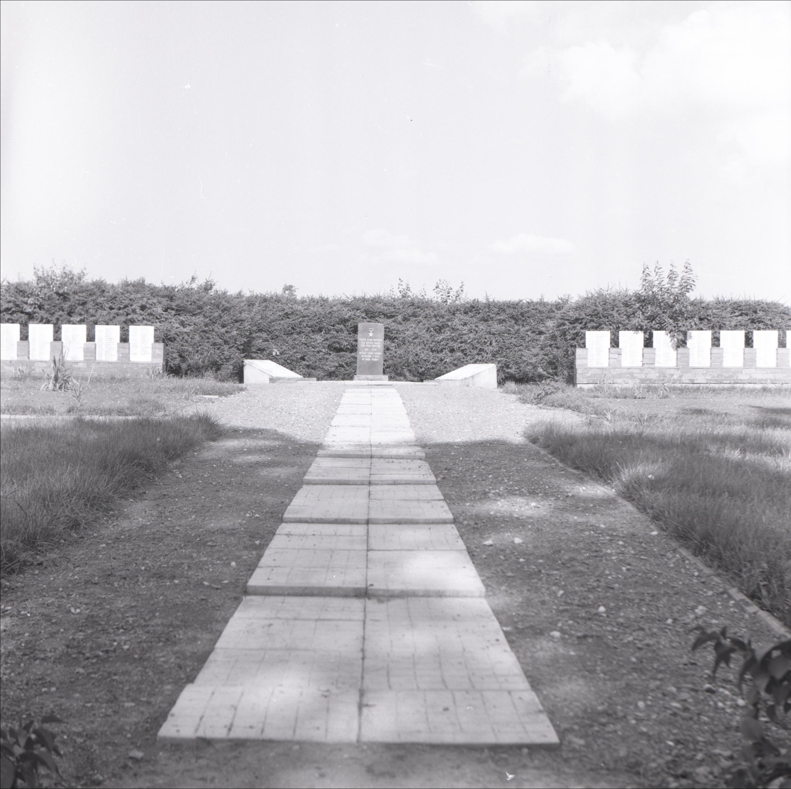 2. Pasaules karā kritušo kapi pie "Spīteru" mājām: Bruģēts celiņš. Tā galā piemineklis, abās pusēs rindā piemiņas plāksnes, kas veido sienu. Fonā krūmi