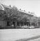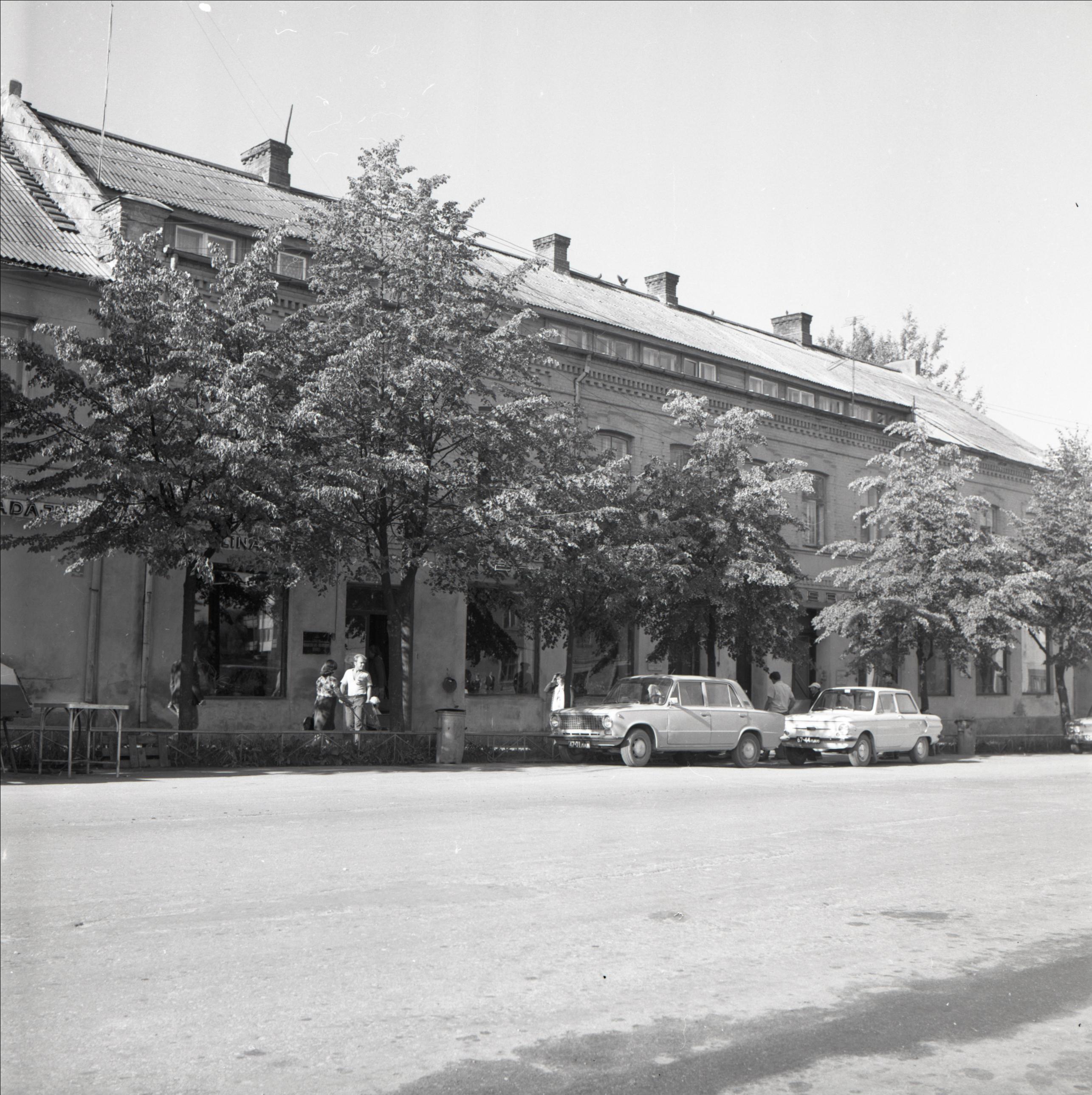 Māja, kura 1919. gadā darbojās revolucionāru komiteja: Ielas fasāde, koki, pie ēkas novietotas divas automašīnas, cilvēki pārvietoas gar ēku