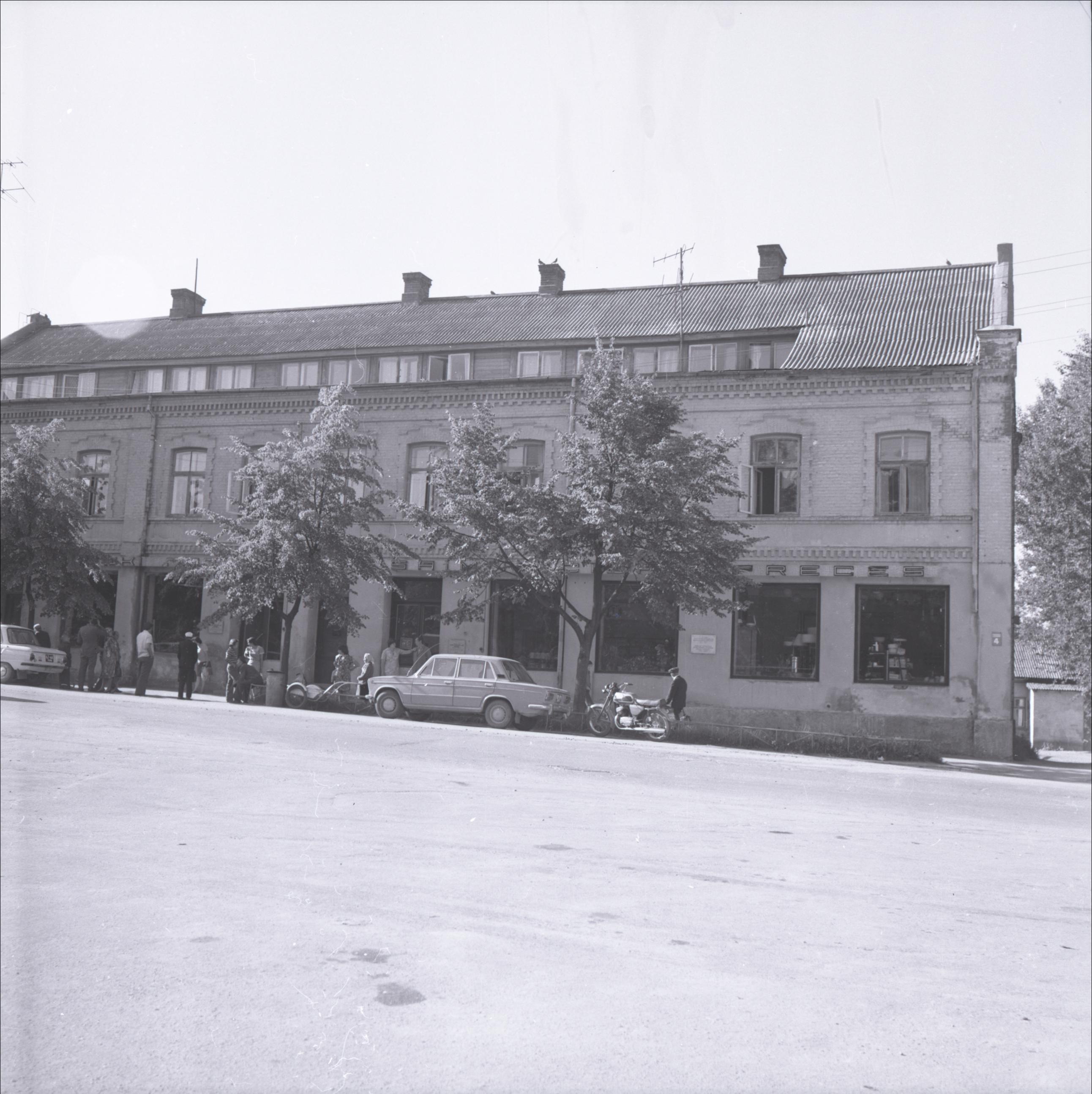 Māja, kura 1919. gadā darbojās revolucionāru komiteja: Ielas fasāde, koki, pie ēkas novietota automašīna un motocikls, cilvēki gaida rindā