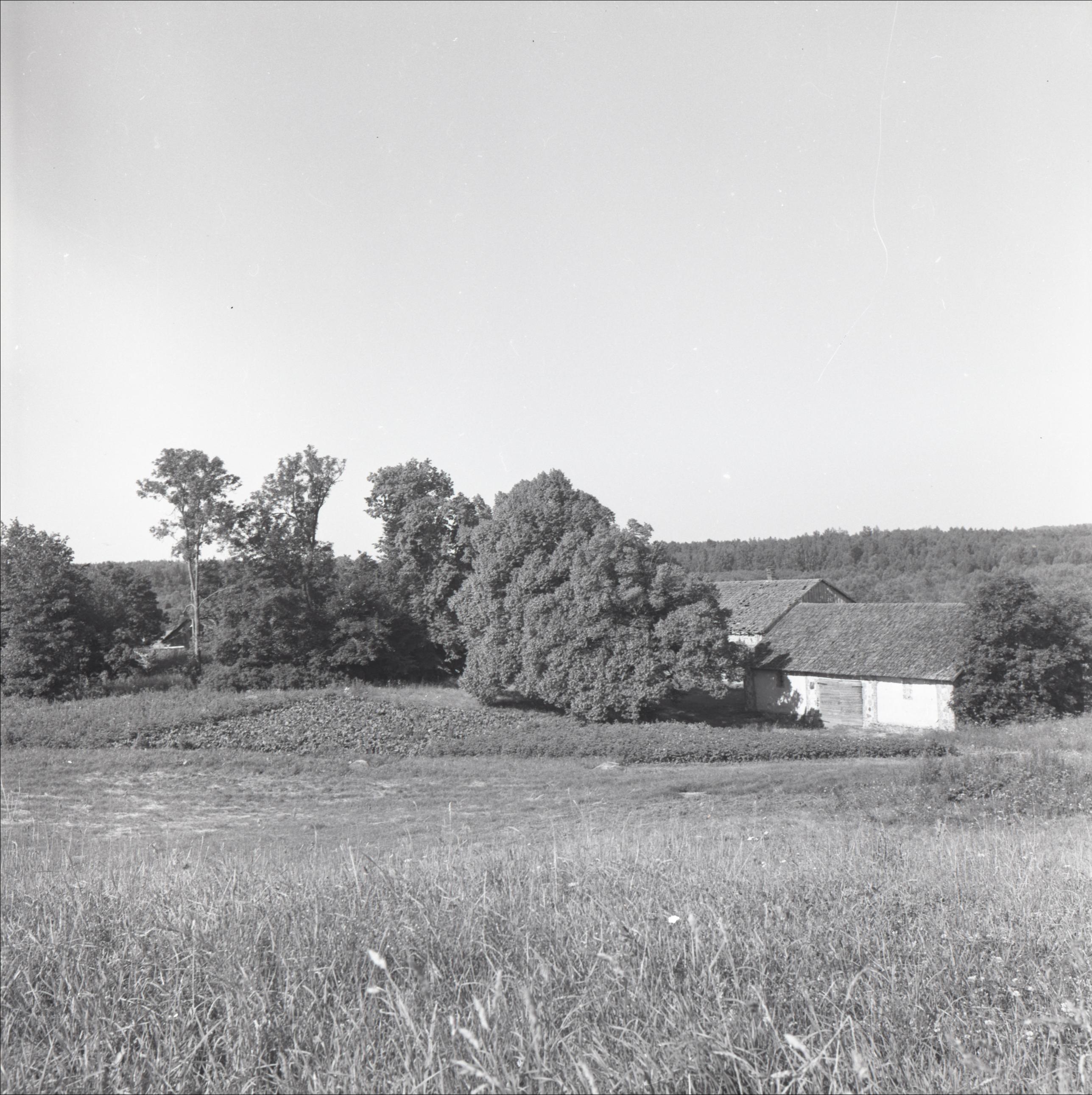Māja "Blaizas", kur dzimis J. Lancmanis: Skats no tāluma, redzamas ēkas, koki, dārzs