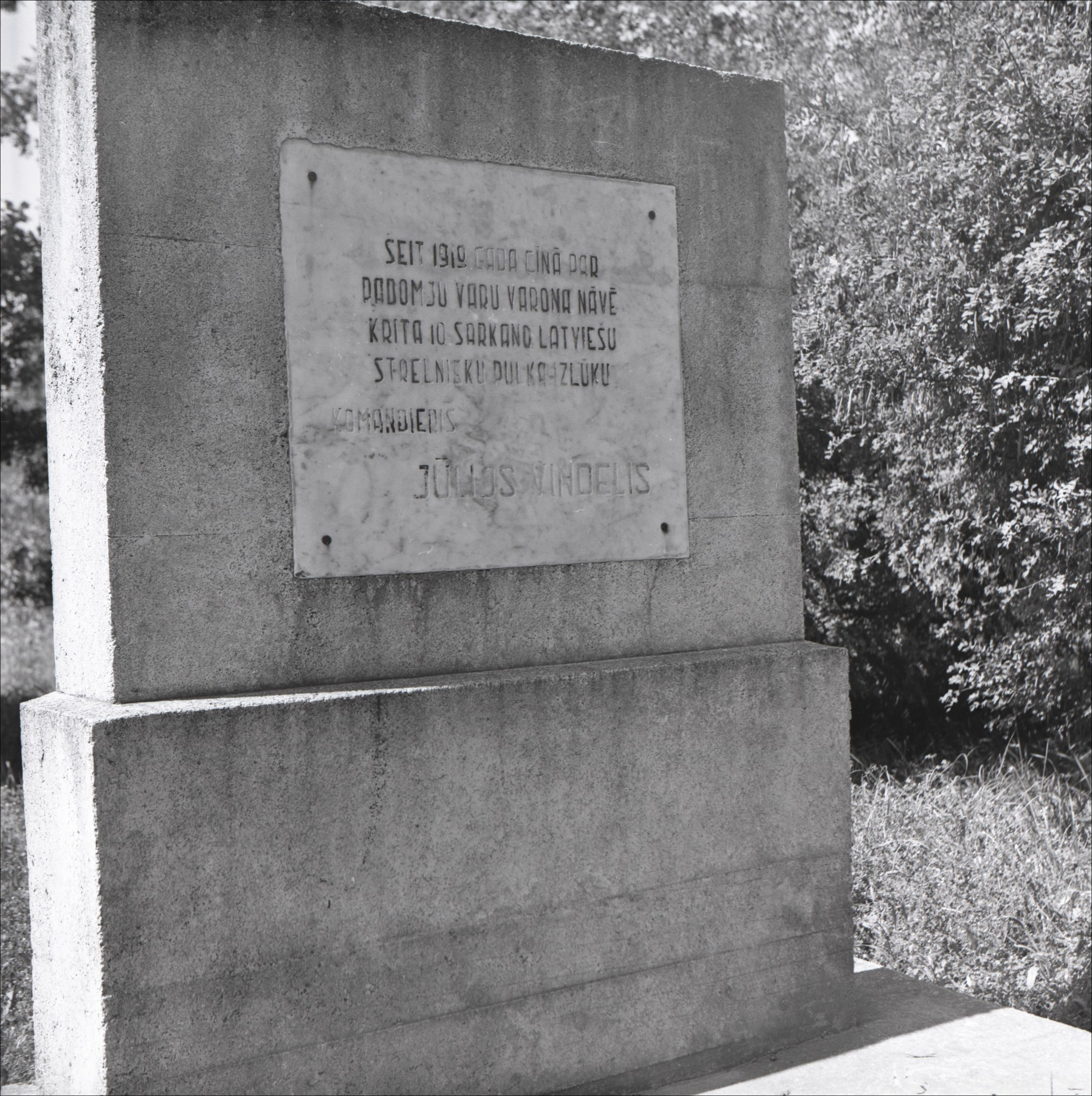 Vieta, kur 1919. gadā krita J. Vendelis: Piemineklis uz postamenta. Uz pieminekļa plāksne un uzraksts.