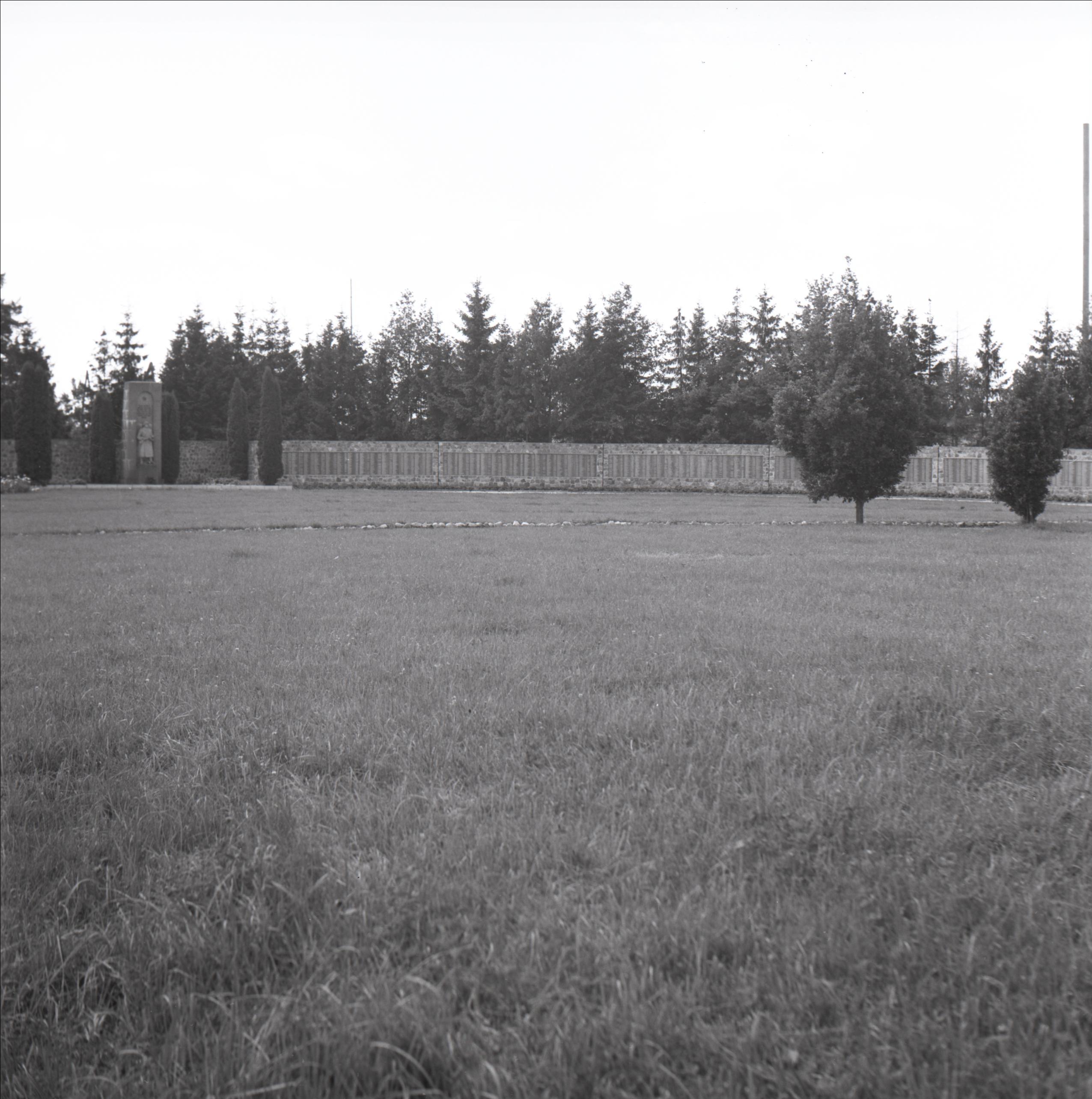 2. Pasaules karā kritušo kapi: Kopskats. Siena ar piemiņas plāksnēm, piemineklis, koki, plašs laukums