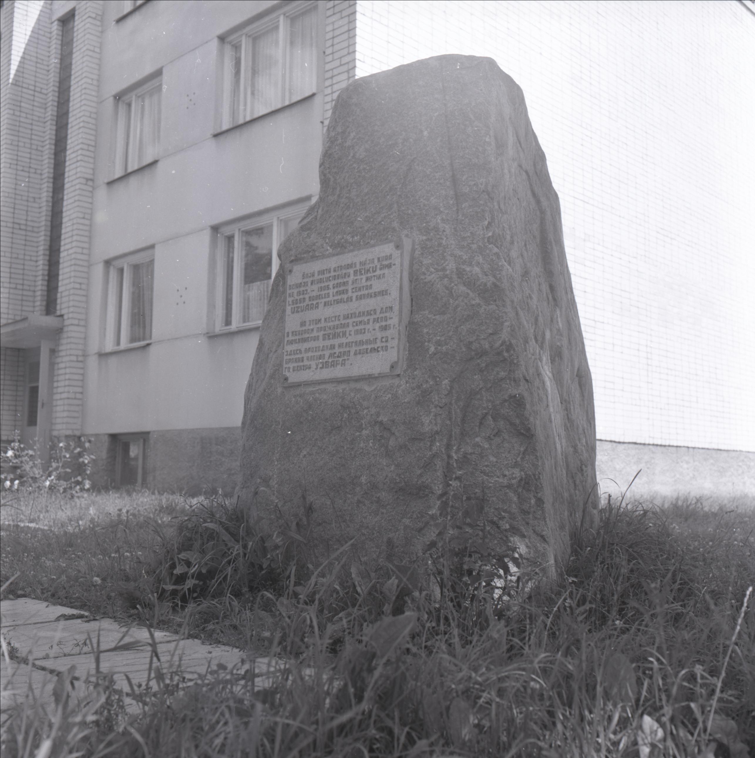 Piemiņas akmens Buku māju vietā: Piemiņas akmens, uz tā piemiņas plāksne ar tekstu. Fonā daudzstāvu dzīvokļu ēka
