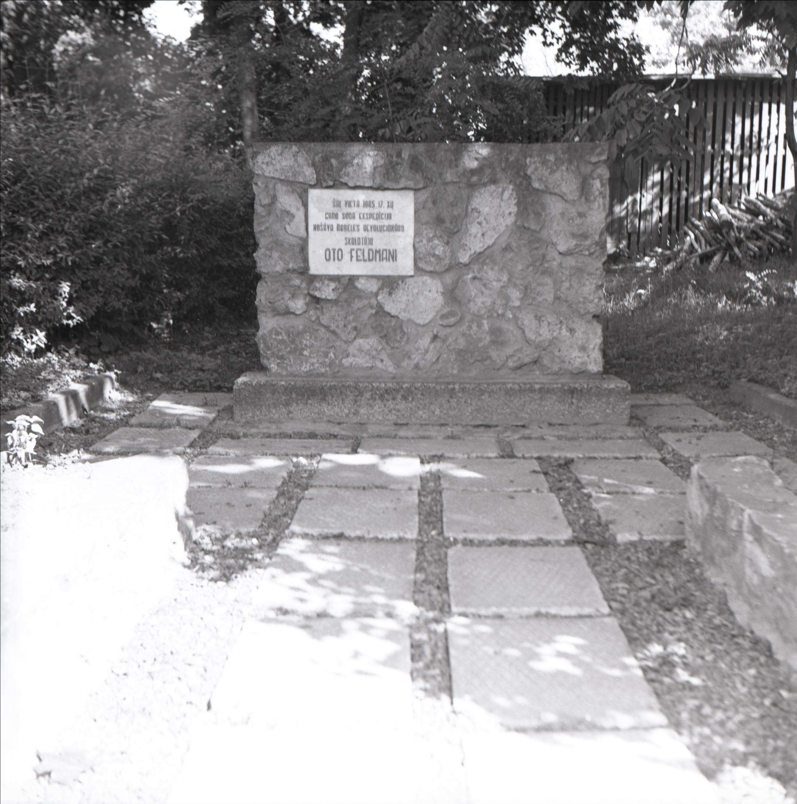 Vieta, kur nošāva Oto Feldmani: Piemineklis uz postamenta. Uz tā plāksne ar tekstu, bruģēts laukums pieminekļa priekšā, fonā koki
