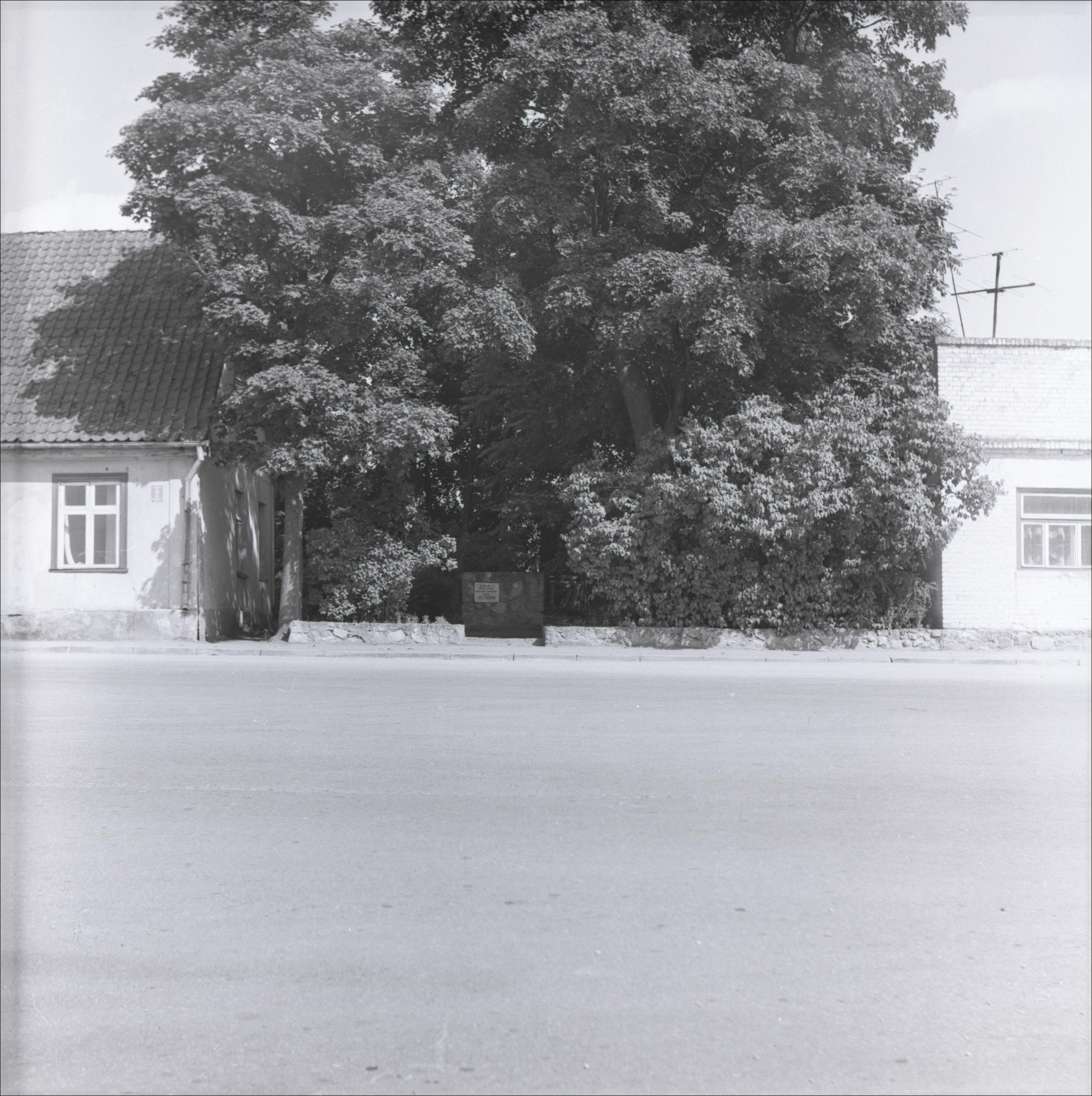 Vieta, kur nošāva Oto Feldmani: Piemineklis starp divām vienstāvu ēkām, apkārt koki