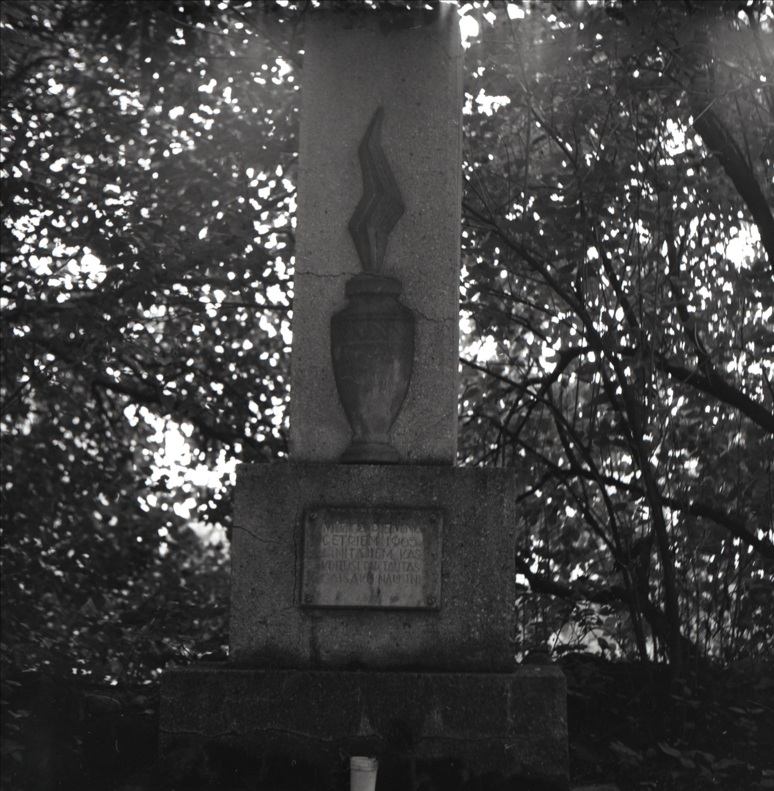 1905. gada revolucionāru kaps: Kapa piemineklis ar plāksni un simbolu. Fonā koki