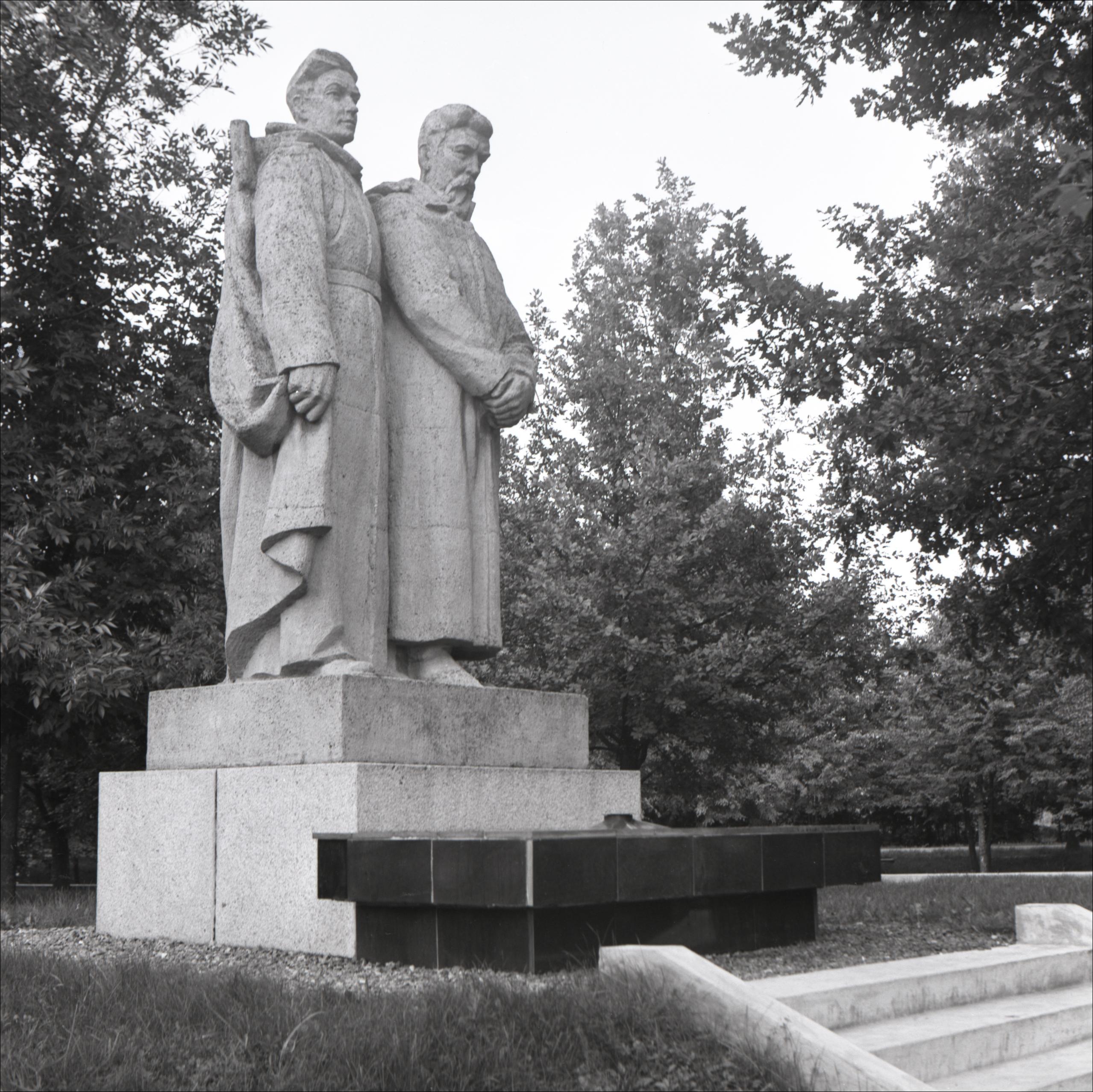 Dobeles brāļu kapi: Piemineklis uz postamenta. Attēlota dubultfigūra – karavīrs un partizāns. Uz pieminekli ved pakāpieni, apkārt koki