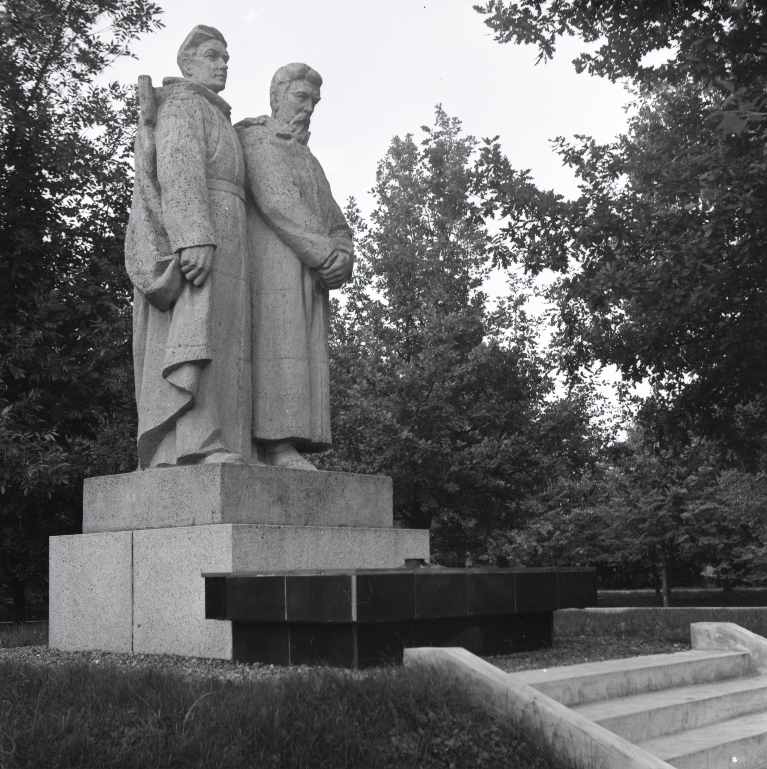 Dobeles brāļu kapi: Piemineklis uz postamenta. Attēlota dubultfigūra – karavīrs un partizāns. Uz pieminekli ved pakāpieni, apkārt koki