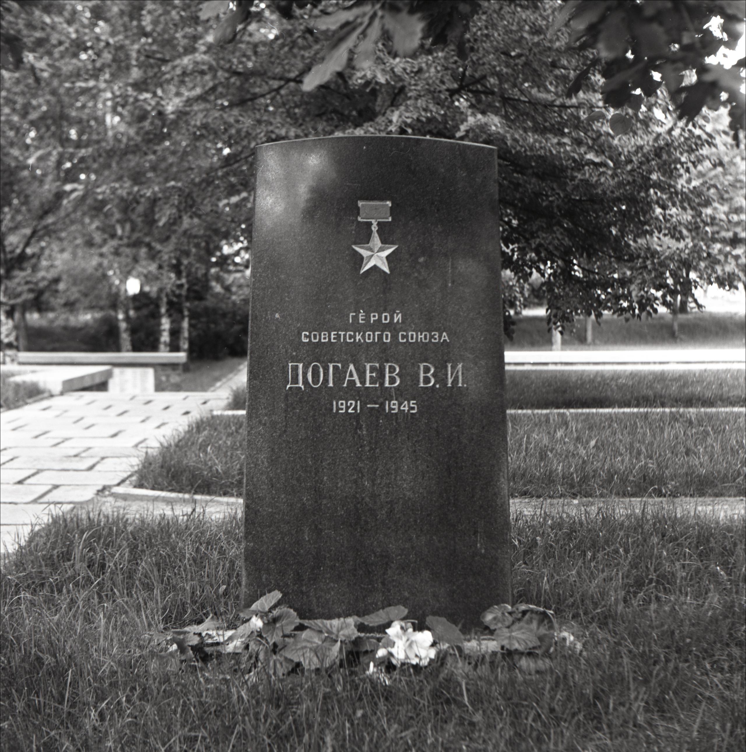 Dobeles brāļu kapi: Piemineklis ar uzrakstu un zvaigzni. Dzimis 1921. gadā, miris 1945.gadā. Pie pieminekļa ziedi