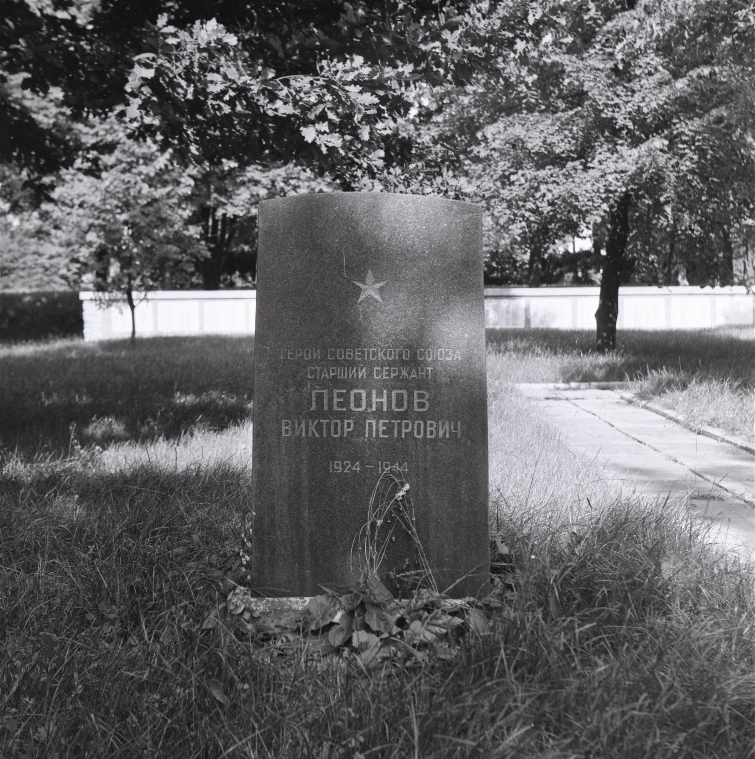 Dobeles brāļu kapi. Viktora Leonova kaps: Piemineklis ar uzrakstu un zvaigzni. Dzimis 1924. gadā, miris 1945.gadā. Pie pieminekļa ziedi