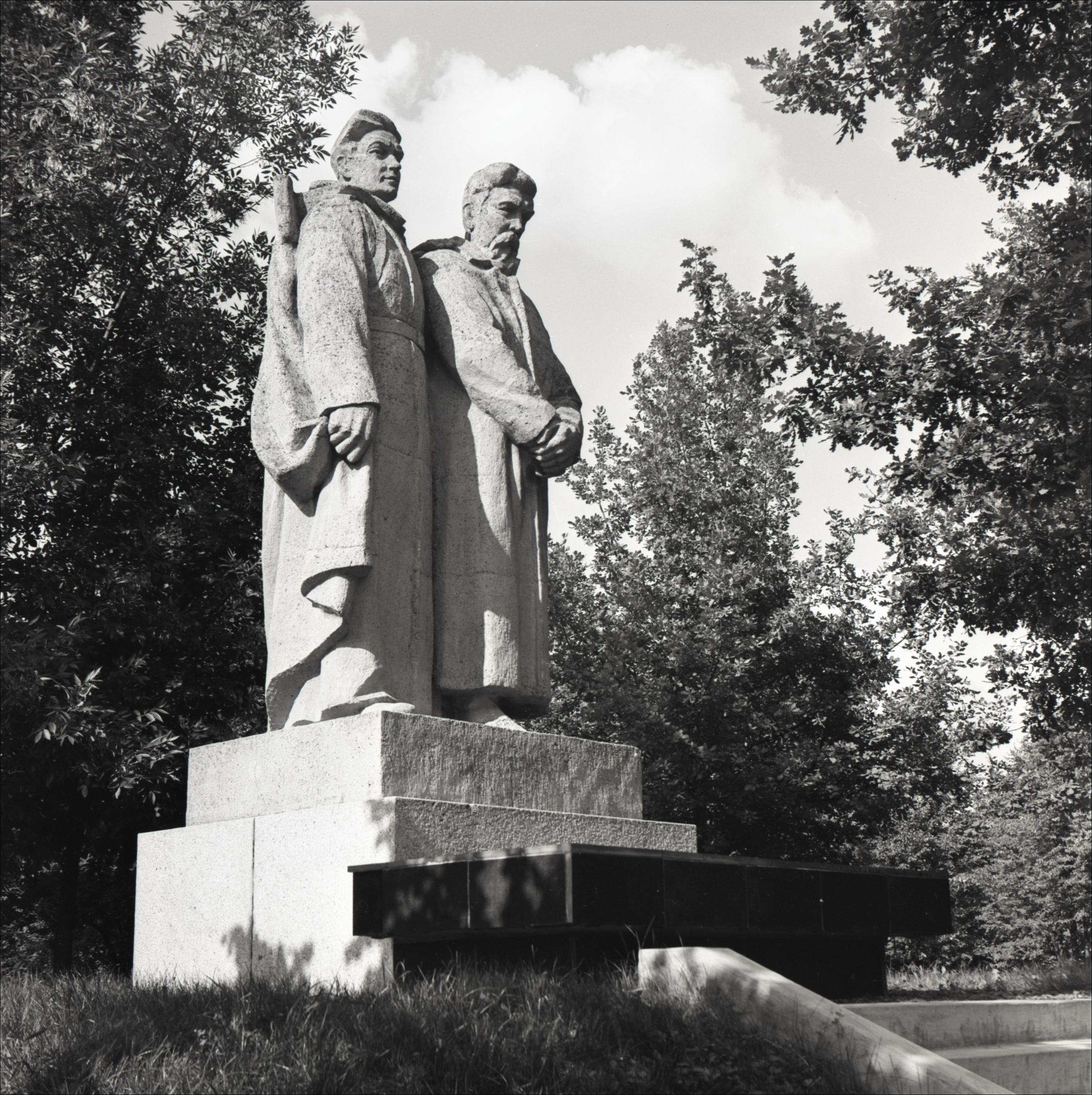 Dobeles brāļu kapi: Piemineklis uz postamenta. Attēlota dubultfigūra – karavīrs un partizāns. Uz pieminekli ved pakāpieni, apkārt koki