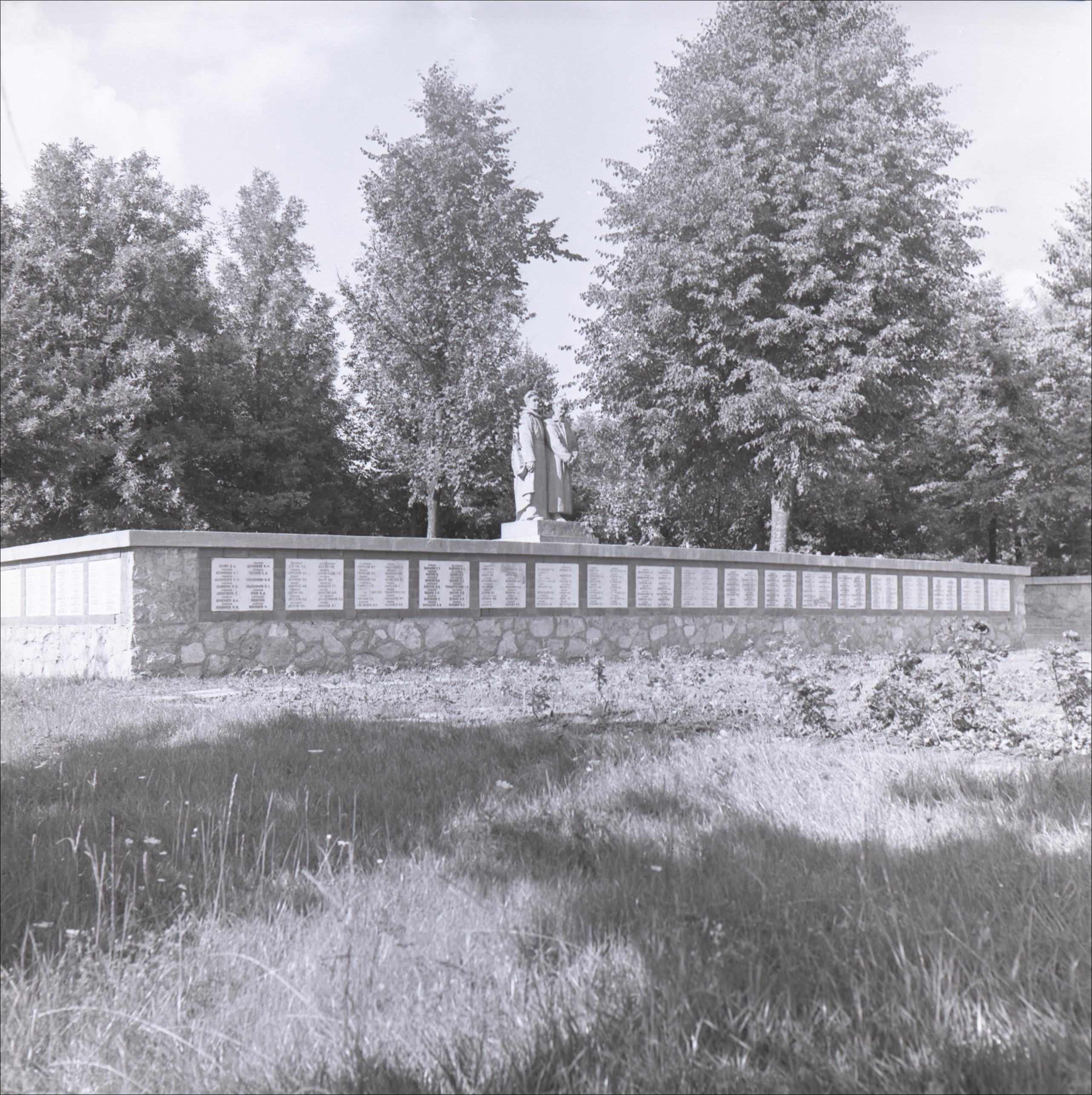 Dobeles brāļu kapi: Kopskats. Piemineklis, attēlota dubultfigūra – karavīrs un partizāns. Pieminekļa pakājē siena ar piemiņas plāksnēm. Apkārt koki