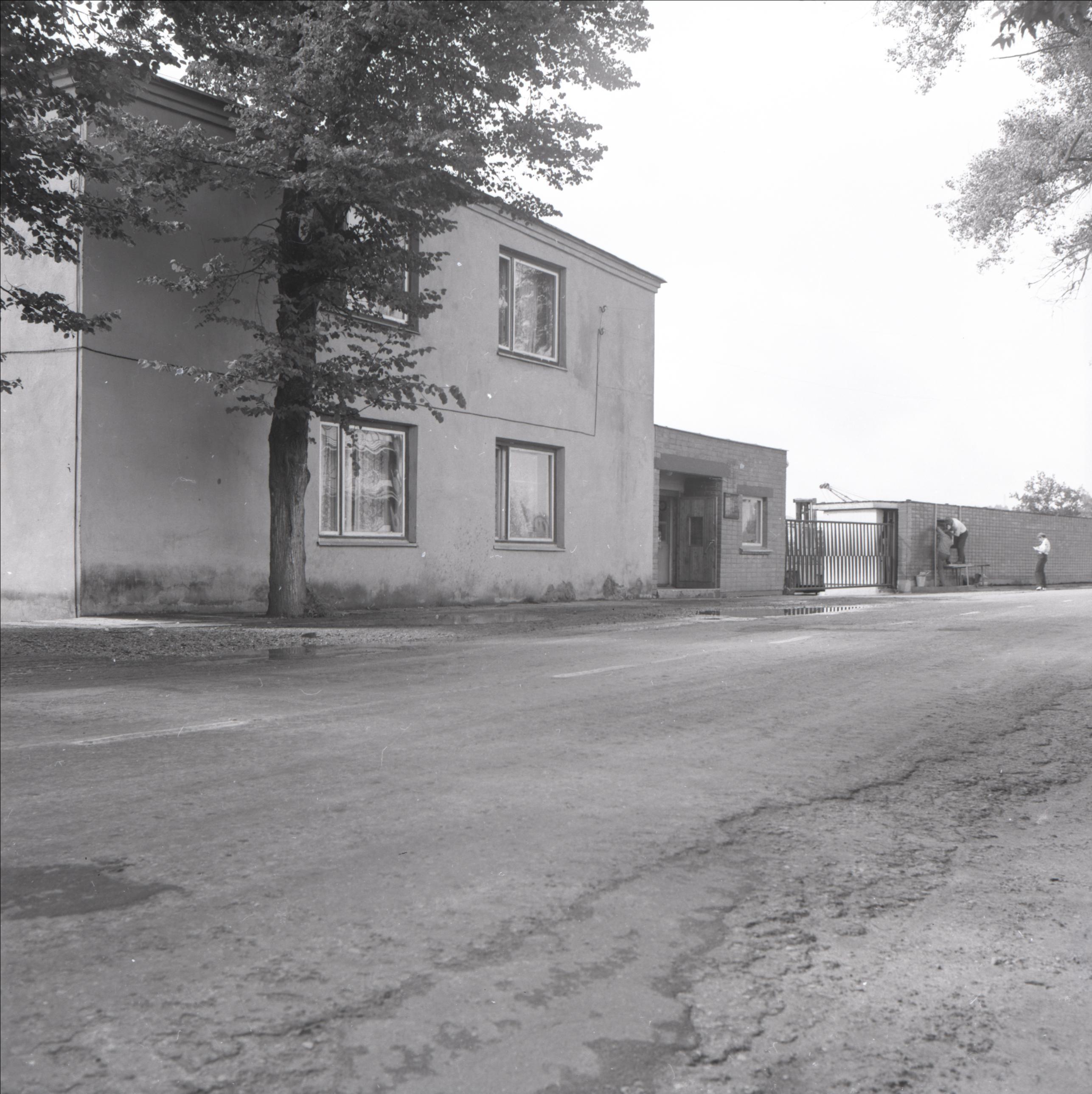Kartona fabrika: Divstāvu ēka, ielas fasāde, ieeja, vārti, žogs, pie tā divi cilvēki, koks, Brīvības iela