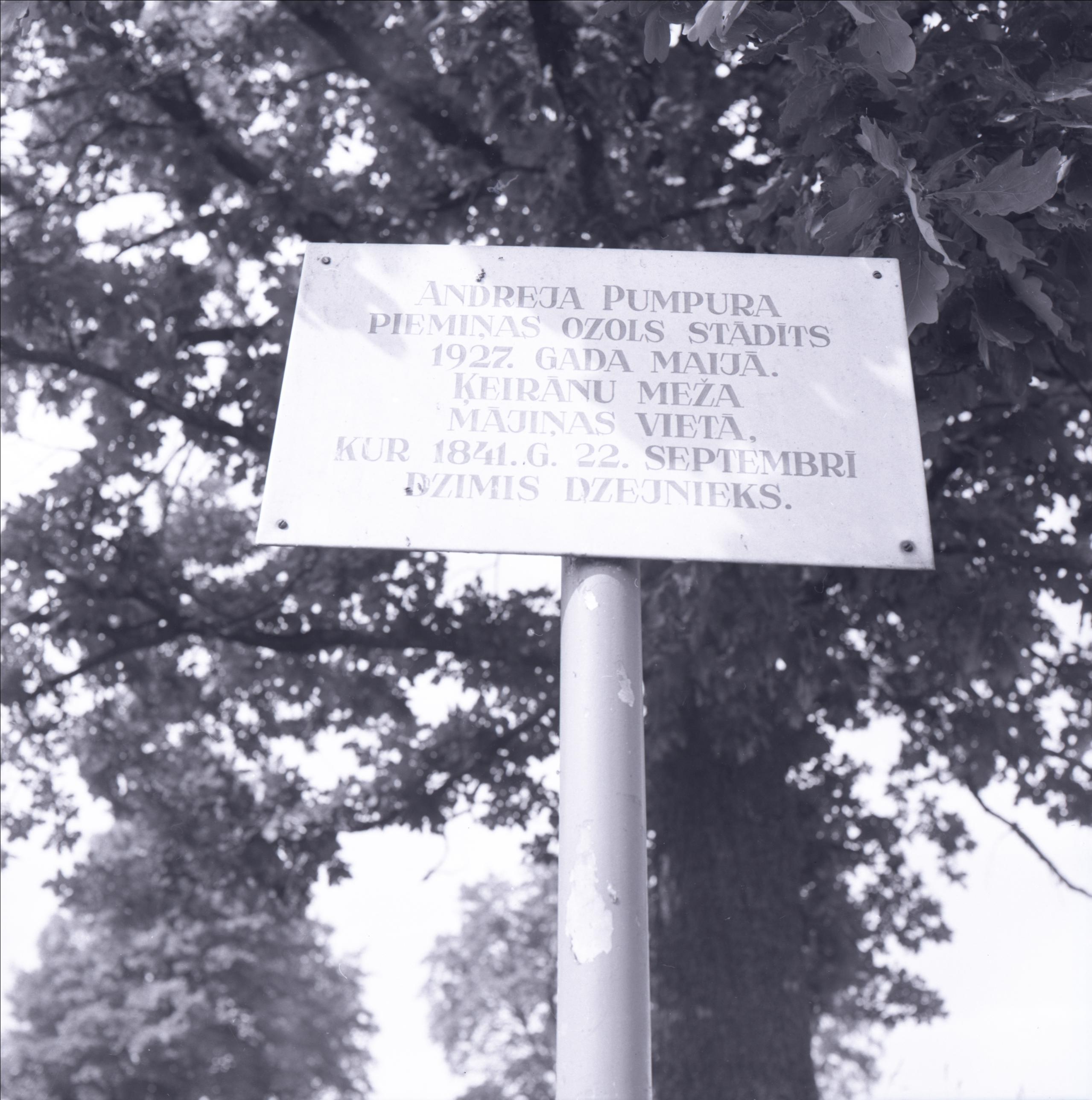 Vieta, kur atradušās Andreja Pumpura dzimtās mājas: Plāksne pie ozola. Informē par Andreja Pumpura piemiņas ozolu, kas stādīts dzimto māju vietā