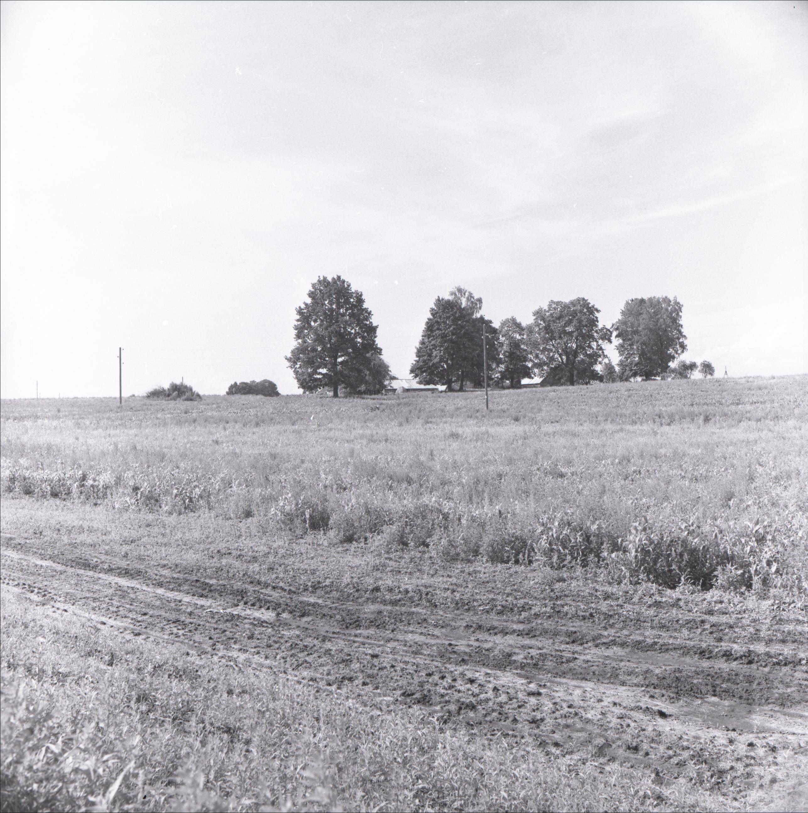 Lobes dzirnavas: Skats no ceļa. Pļava, tālumā redzami koki, ēka