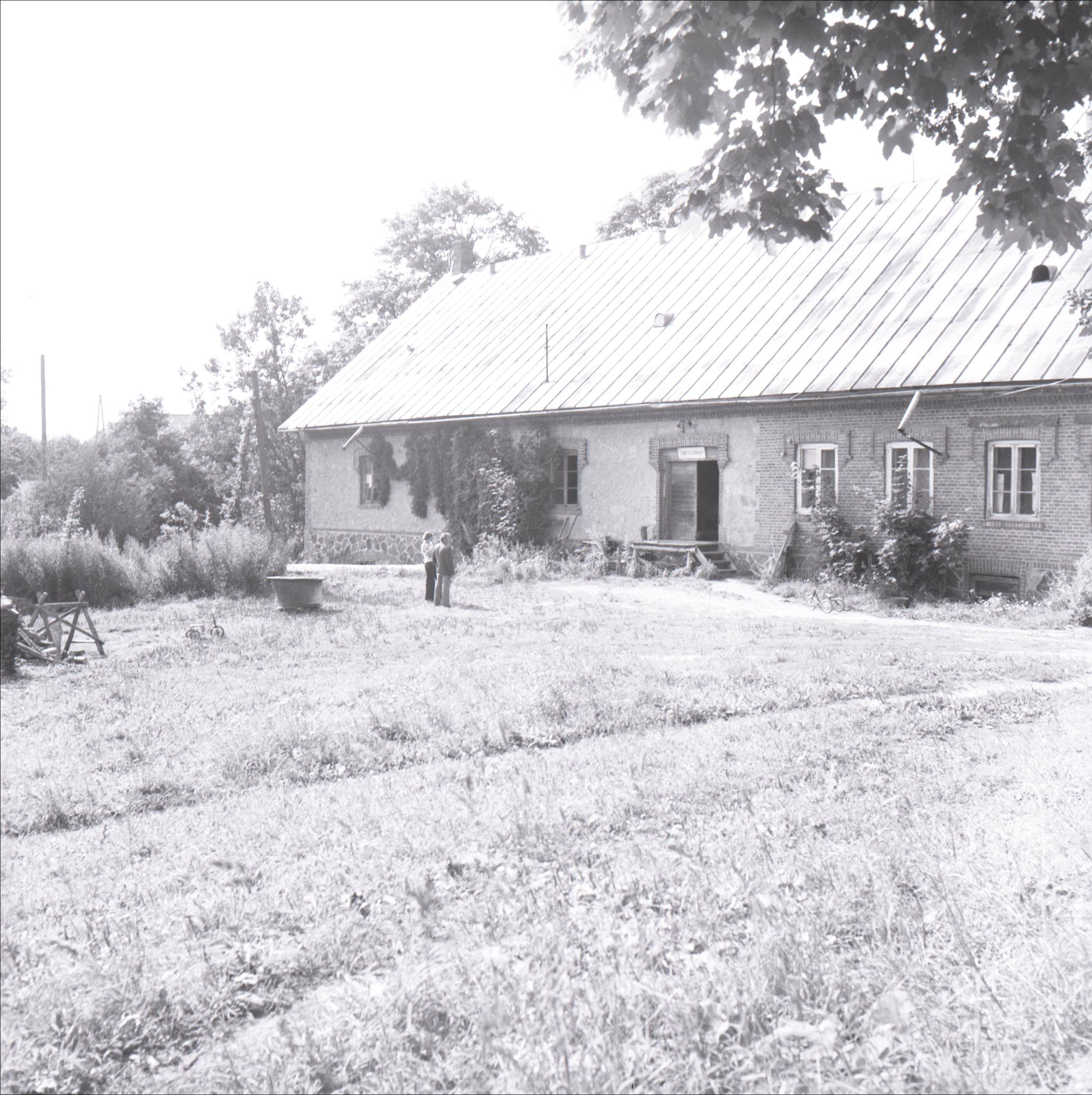Lobes dzirnavas: Galvenā fasāde, ieeja, pagalmā divi cilvēki