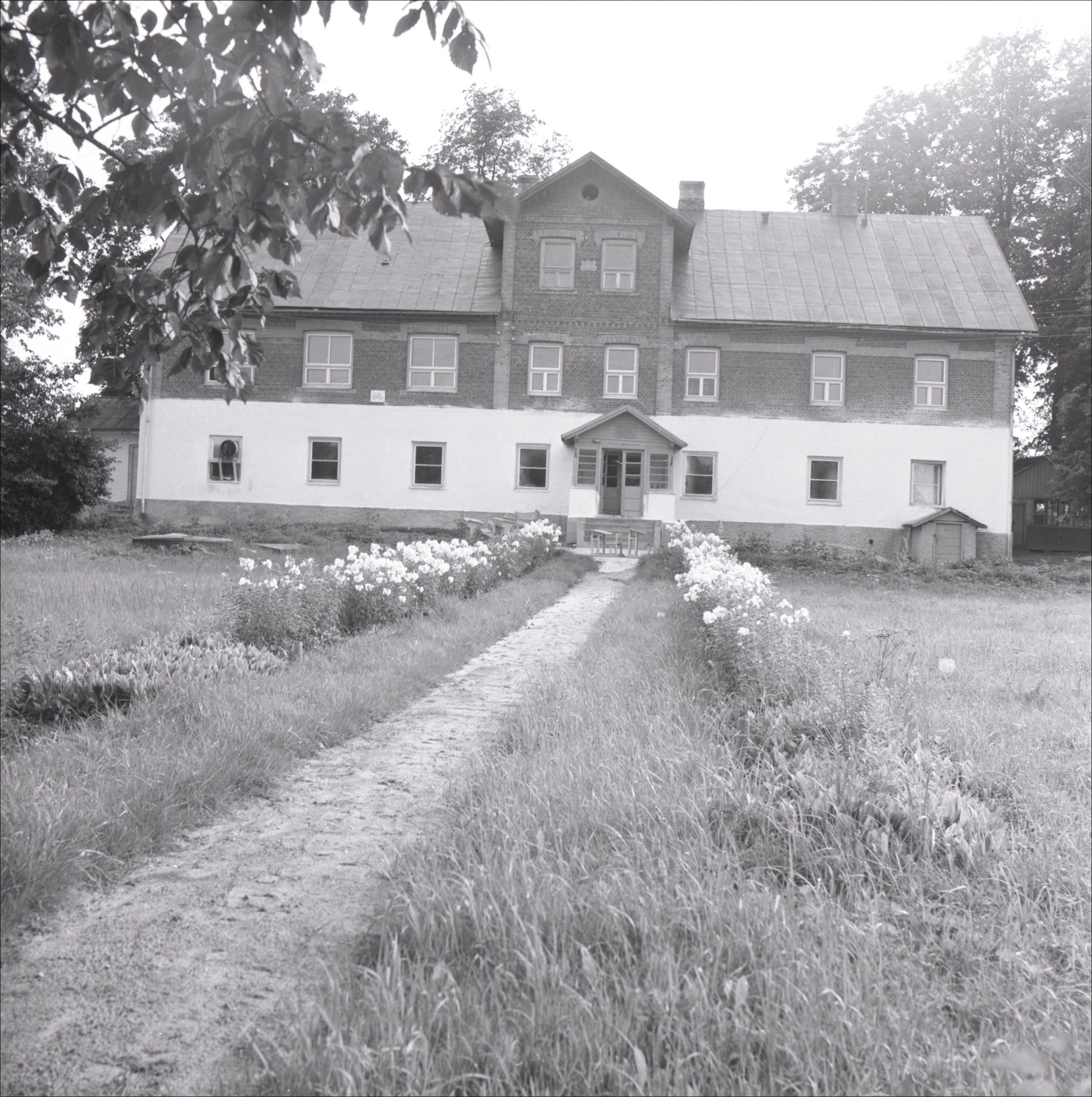 Krapes skola: Galvenā fasāde, ieeja, apstādījumi skolas priekšā, celiņš