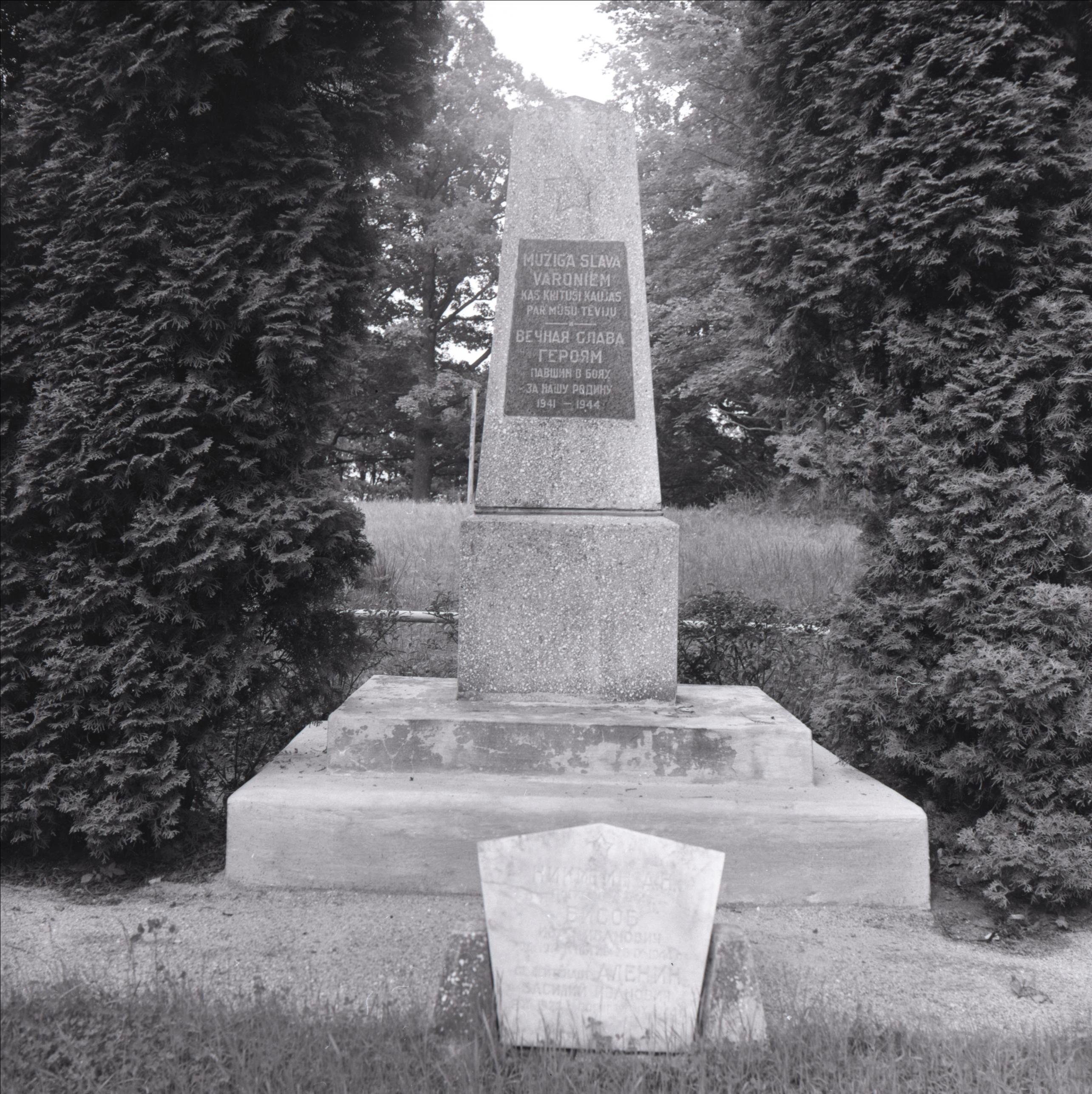 2. pasaules kara brāļu kapi: Obelisks. Plāksne, uz tās uzraksts latviešu un krievu valodā, tūjas