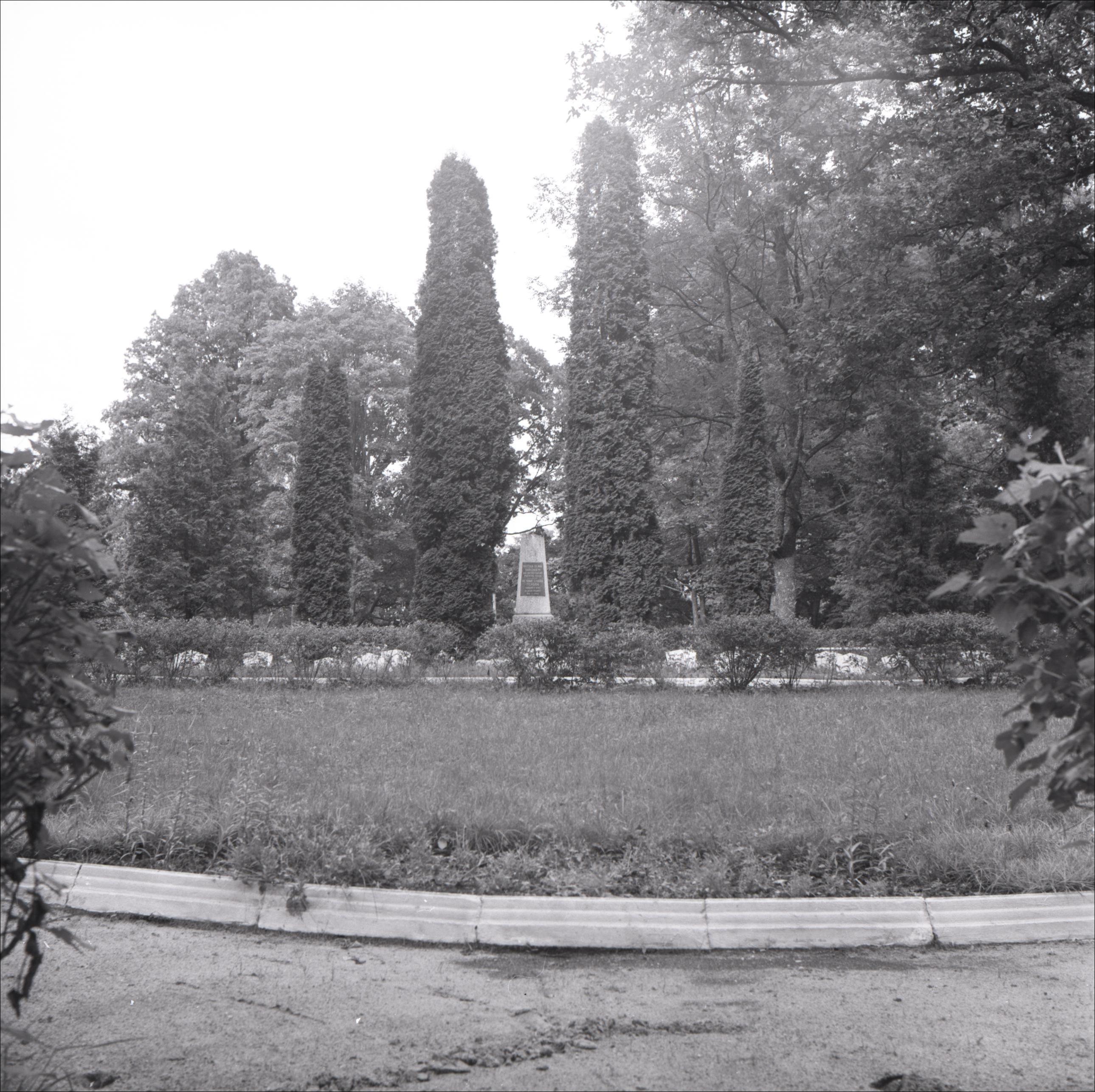 2. pasaules kara brāļu kapi: Obelisks, uz tā plāksne, abās malās tūjas, piemiņas plāksnes, apstādījumi