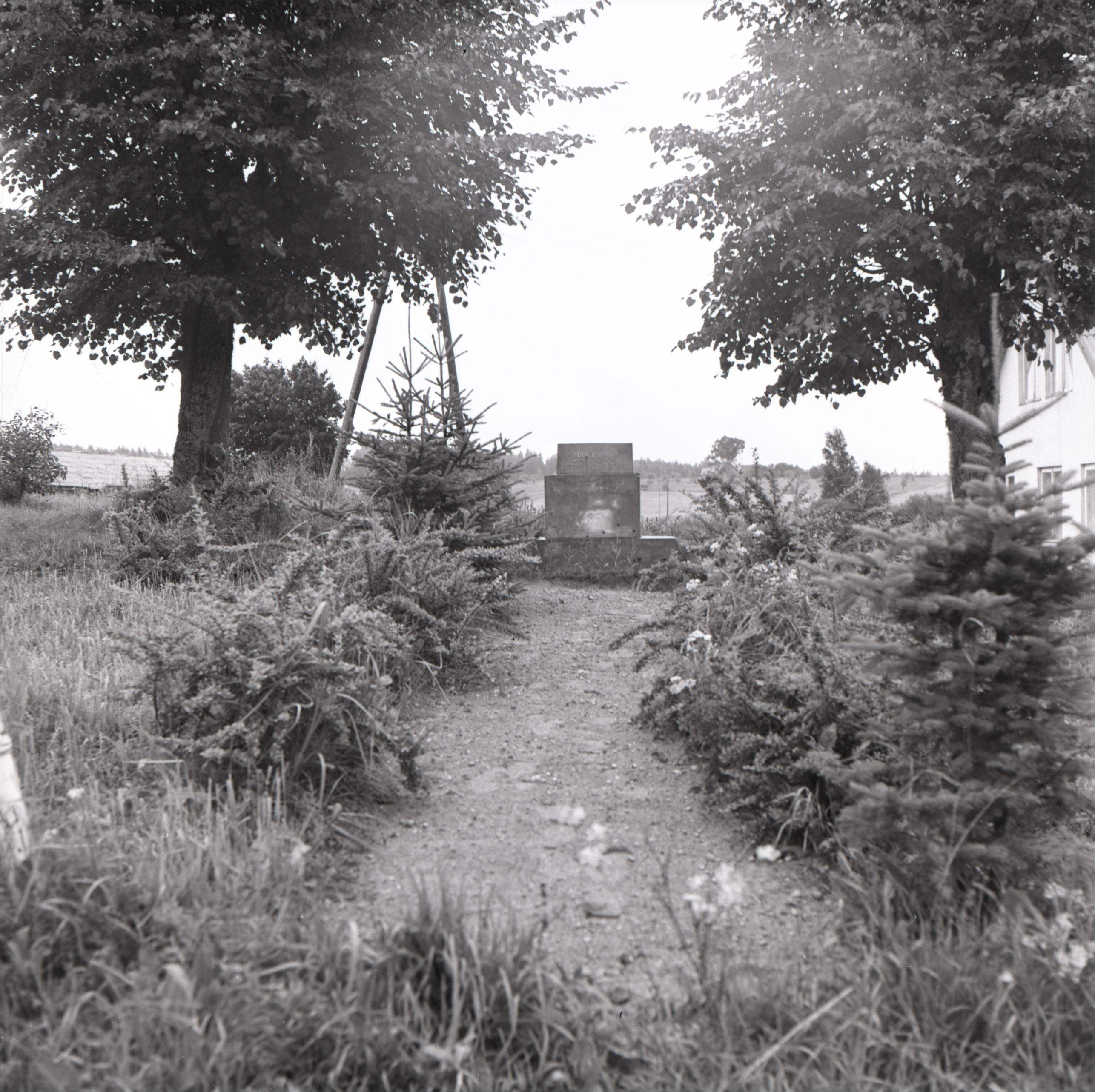J. Ezeriņa noslepkavošanas vieta: Piemineklis ar plāksni, tam apkārt koki un krūmi, fonā ēka