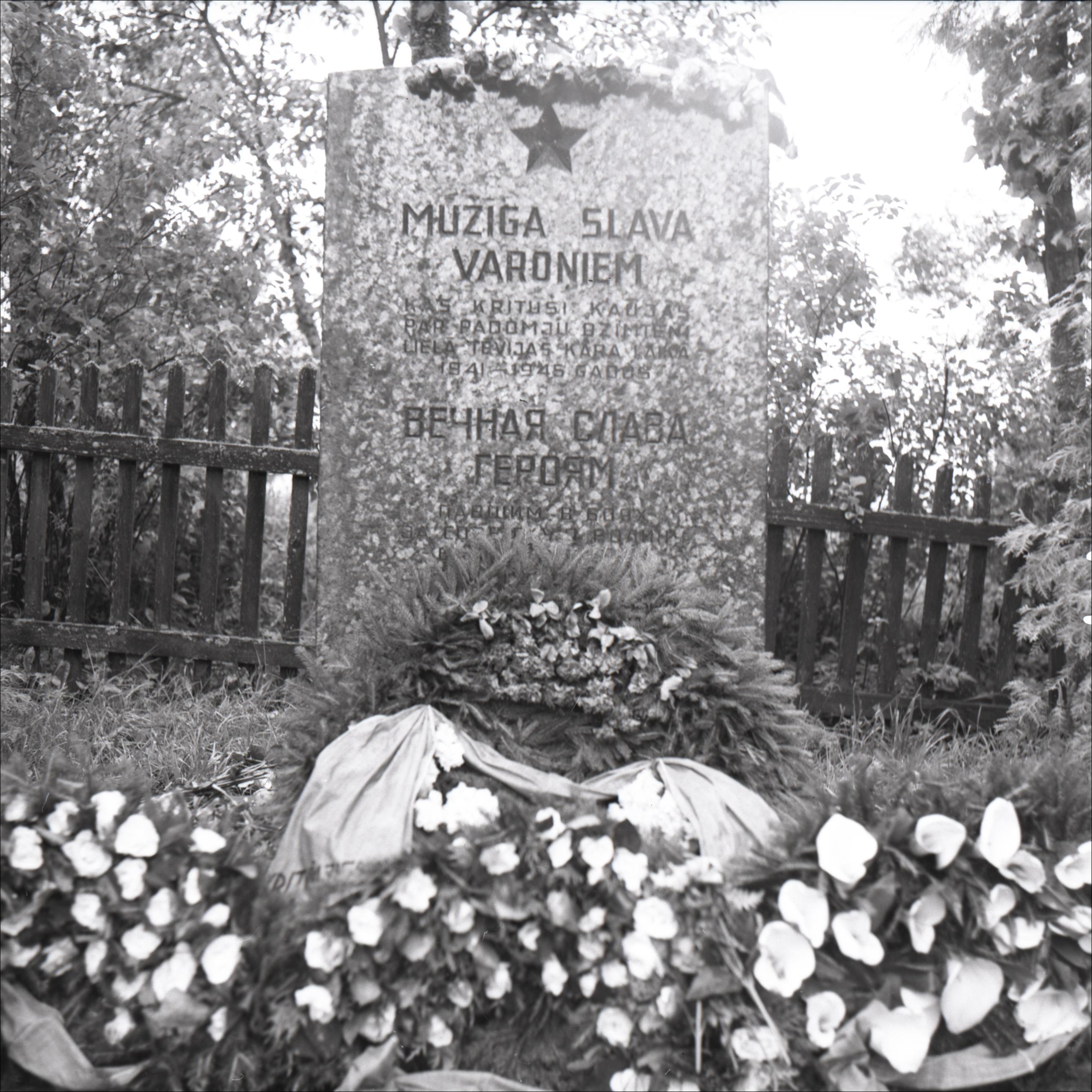 2. pasaules kara brāļu kapi: Piemineklis ar uzrakstu latviešu un krievu valodās, skuju vainags, fonā sēta