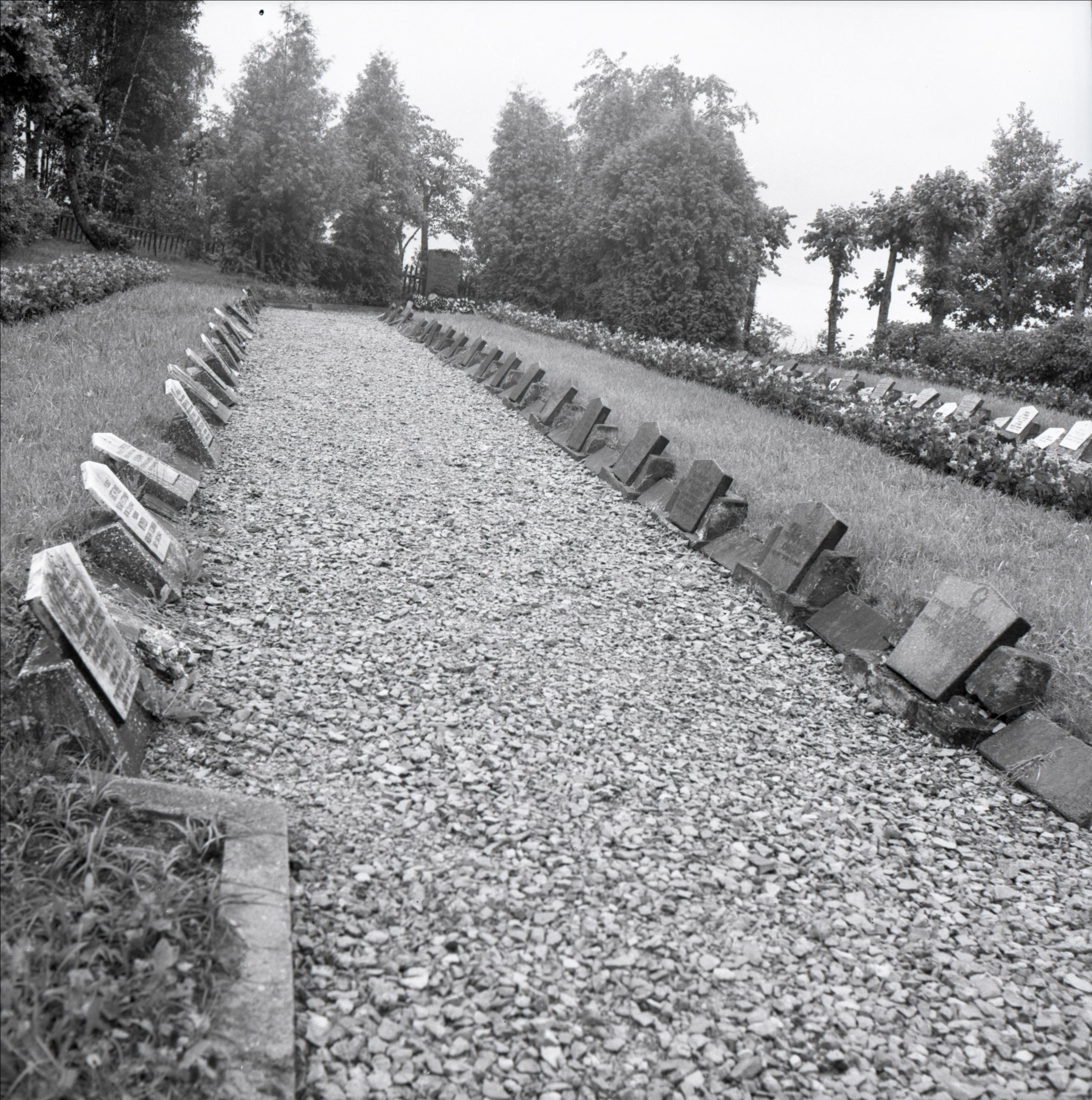 2. pasaules kara brāļu kapi: Piemiņas plāksnes trīs rindās, pa vidu ceļiņš nobērts šķembām