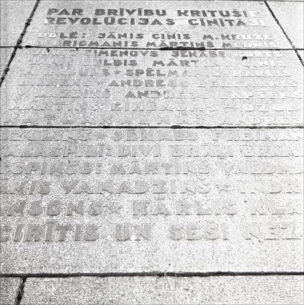 Piemineklis 1905. gada revolucionāriem: Fragments – uzraksts uz pieminekļa pamatnes "Par brīvību kritušie revolūcijas cīnītāji", kam seko kritušo vārdi.