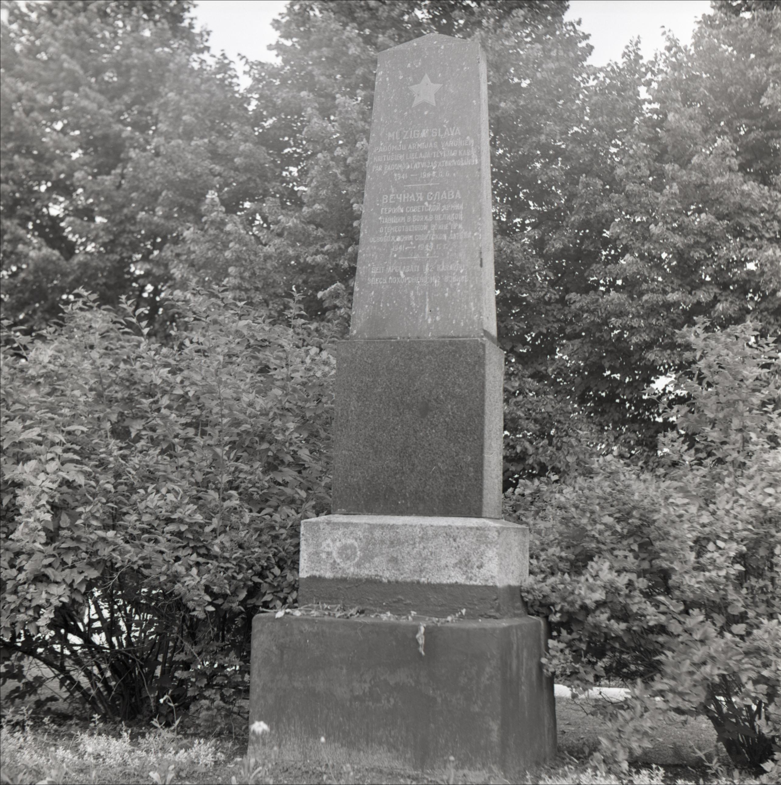 2. pasaules kara kapi pie "Rogu" mājām: Obelisks ar zvaigzni un uzrakstu latviešu un krievu valodā. Aiz tā koki, krūmi