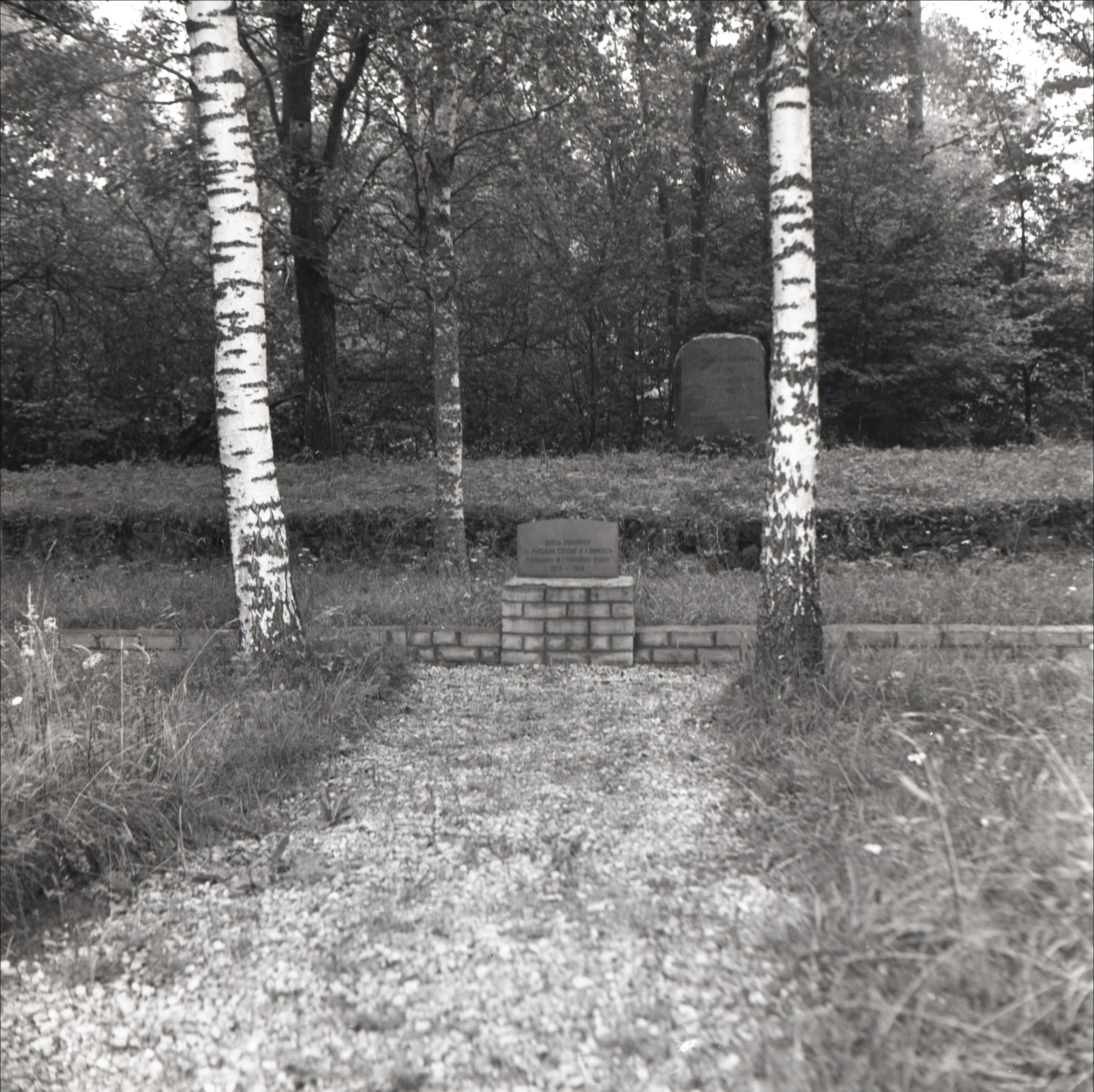 1. pasaules kara kapi pie "Skuju" mājām: Plāksne ar uzrakstu krievu valodā, kas novietota uz ķieģeļu mūra. Apkārt bērzi, ķieģeļu apmale. Fonā redzams piemineklis
