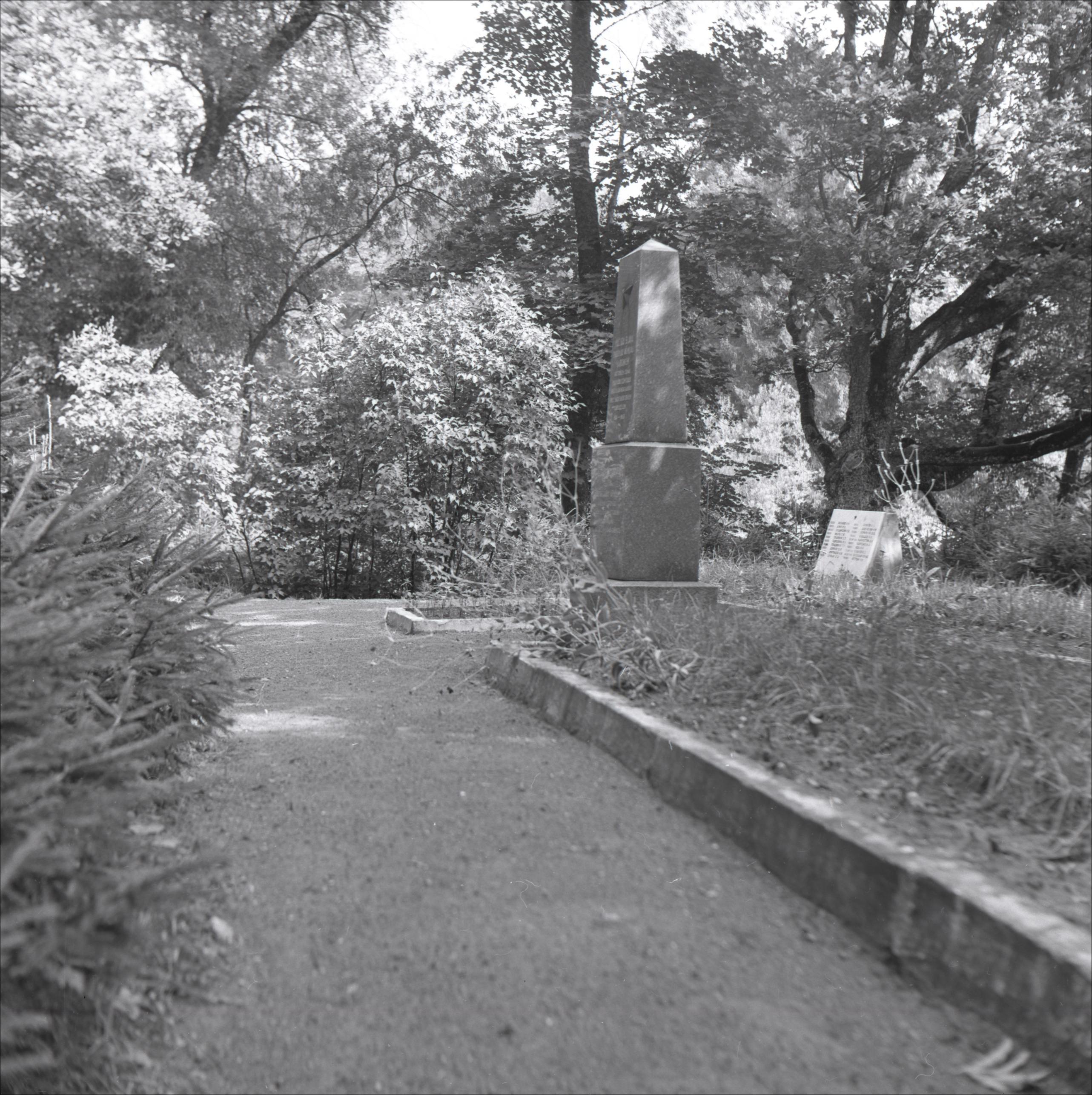 2. pasaules kara kapi parkā: Obelisks, tam apkārt apstādījumi, fonā piemiņas plāksne