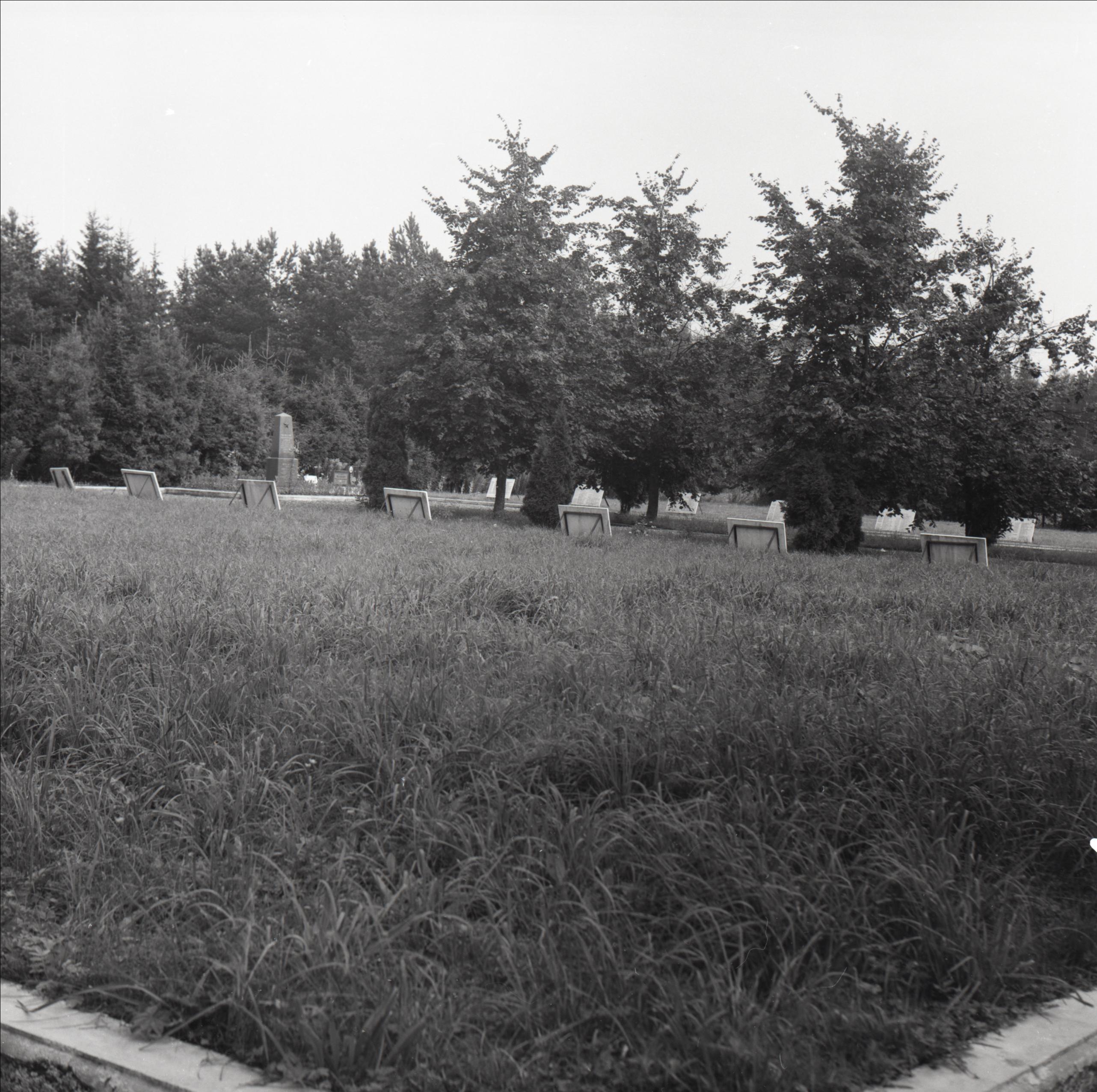 2. pasaules kara kapi pie pansionāta: Piemiņas plākšņu aizmugures. Rindā septiņas plāksnes. Fonā redzams obelisks, koki