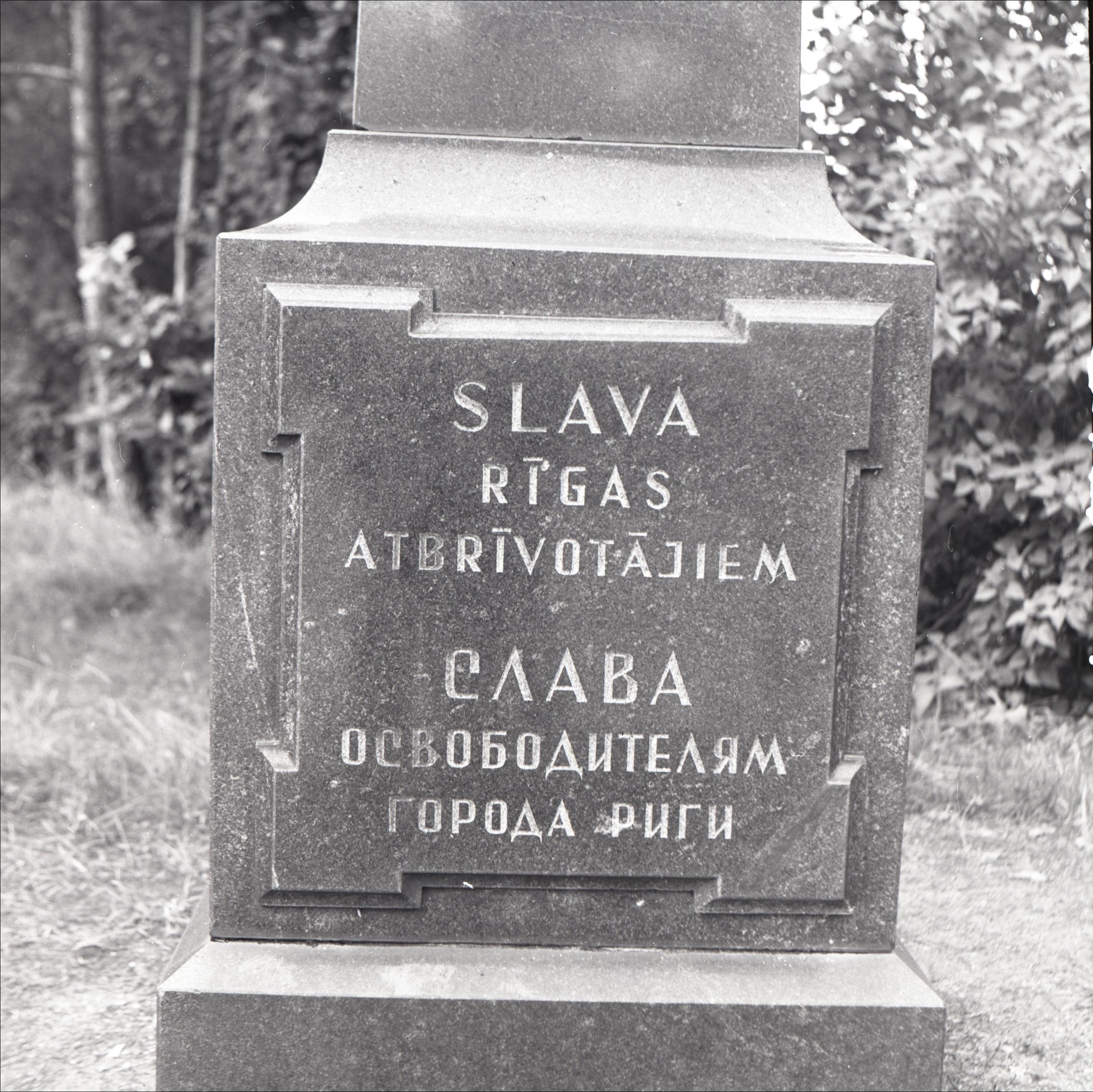 Obelisks Rīgas atbrīvotājiem: Obeliska pamatne. Uz tās teksts latviešu un krievu valodā
