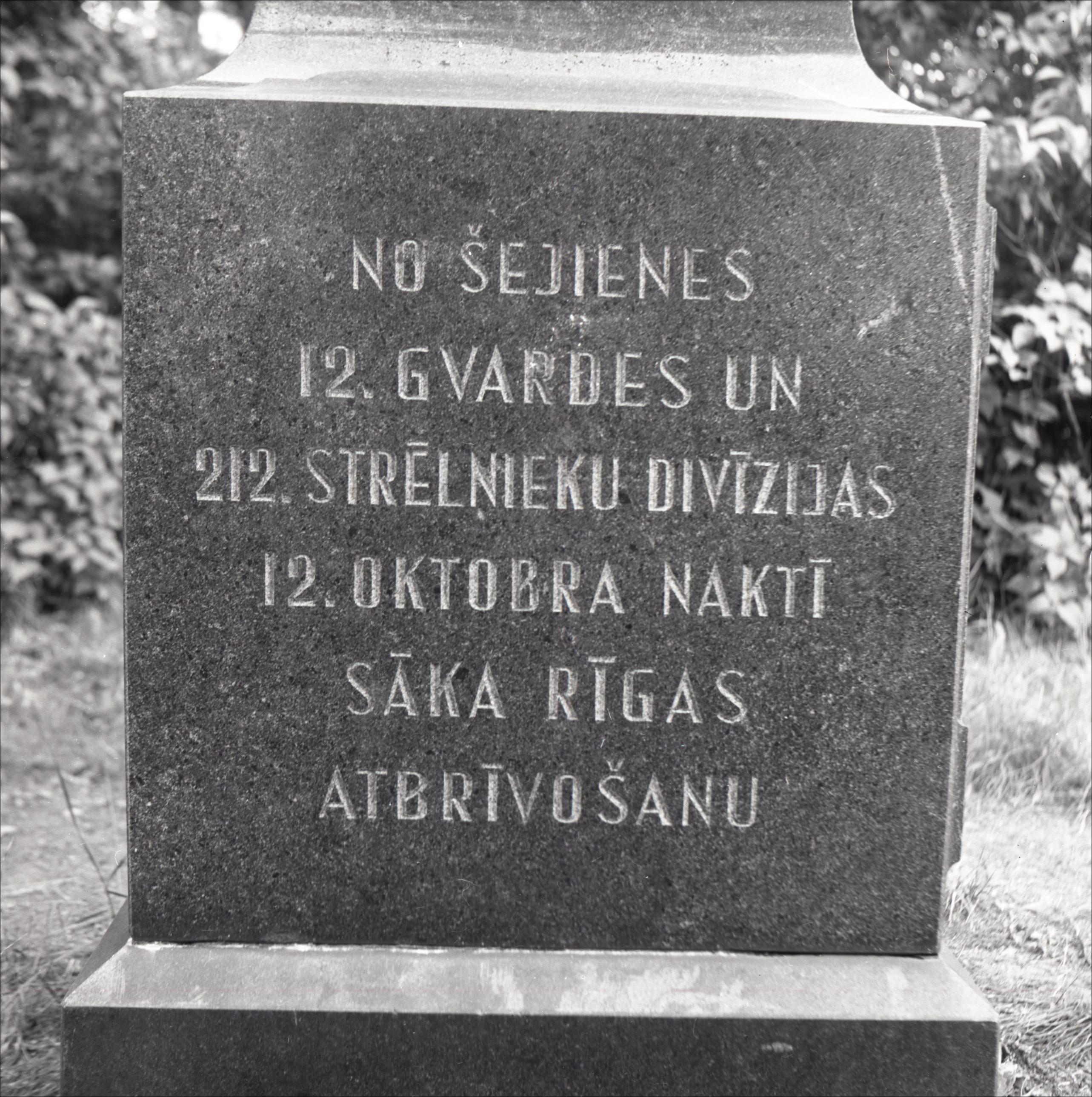Obelisks Rīgas atbrīvotājiem: Obeliska pamatne. Uz tās teksts latviešu valodā