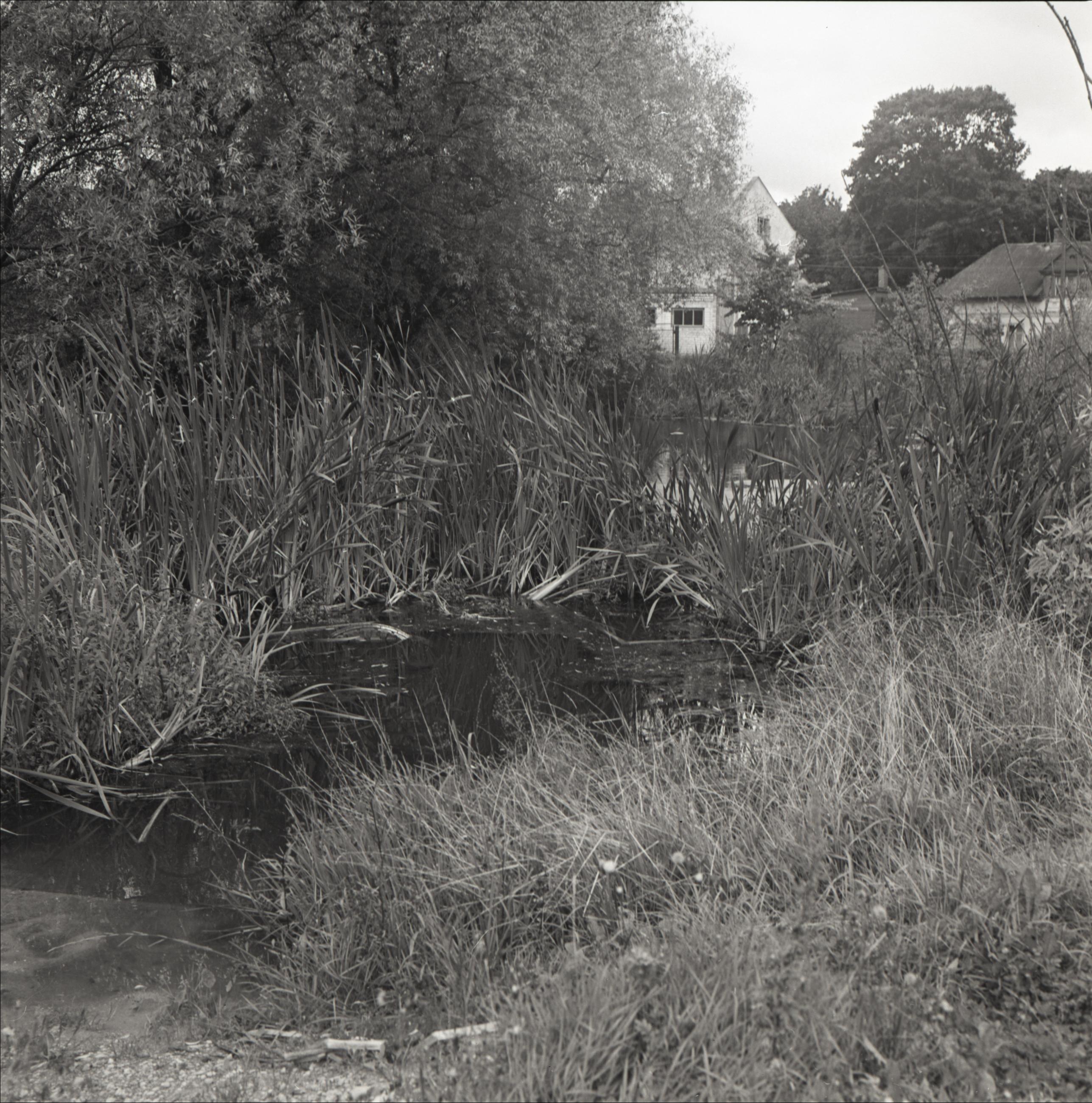 Borku dīķis: Dīķis, niedres, koki, fonā divas dzīvojamās ēkas