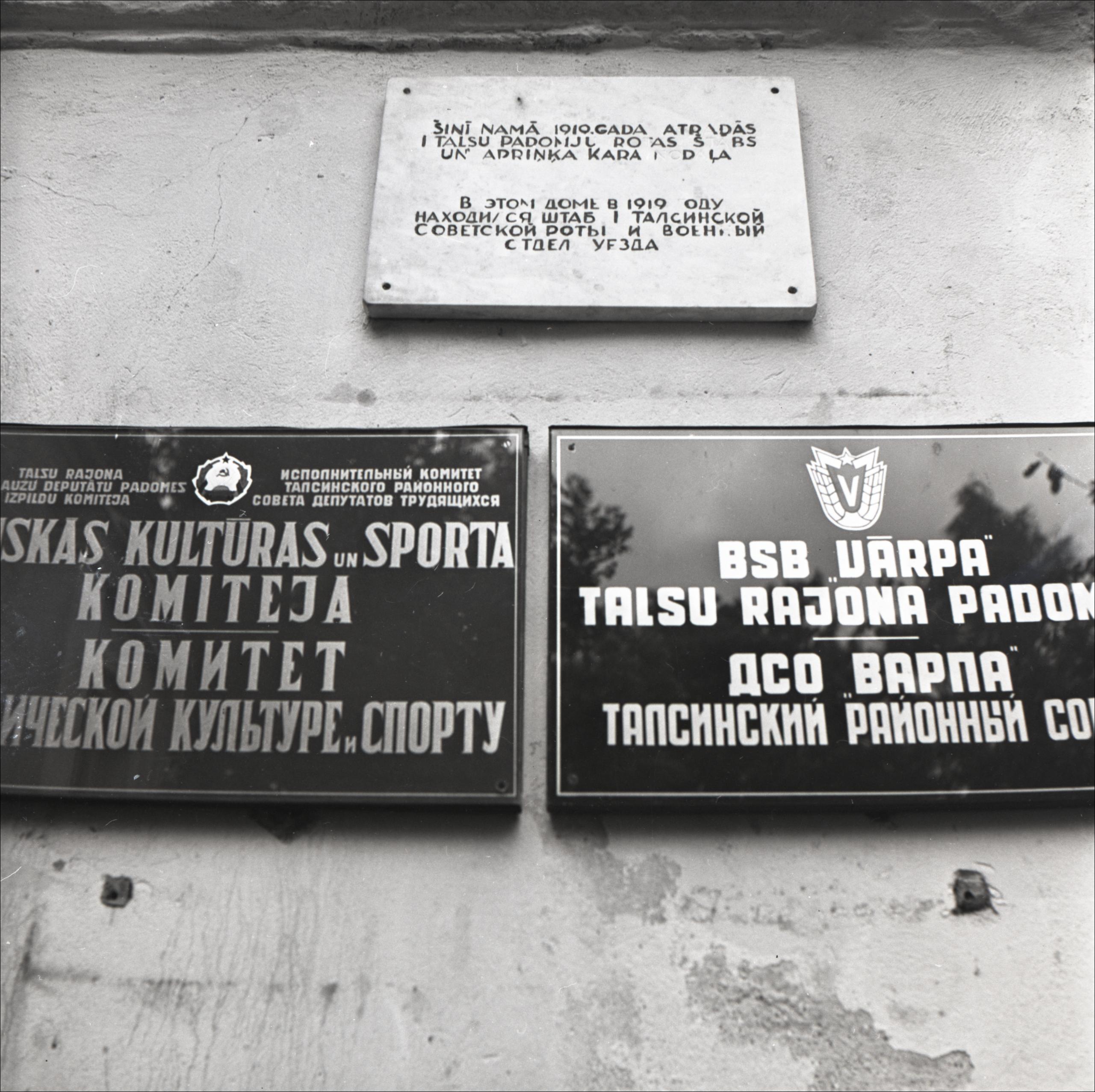 Ēka: Trīs plāksnes. Informē, ka ēka darbojās kara nodaļa, kultūras un sporta komiteja, BSB "Vārpa"