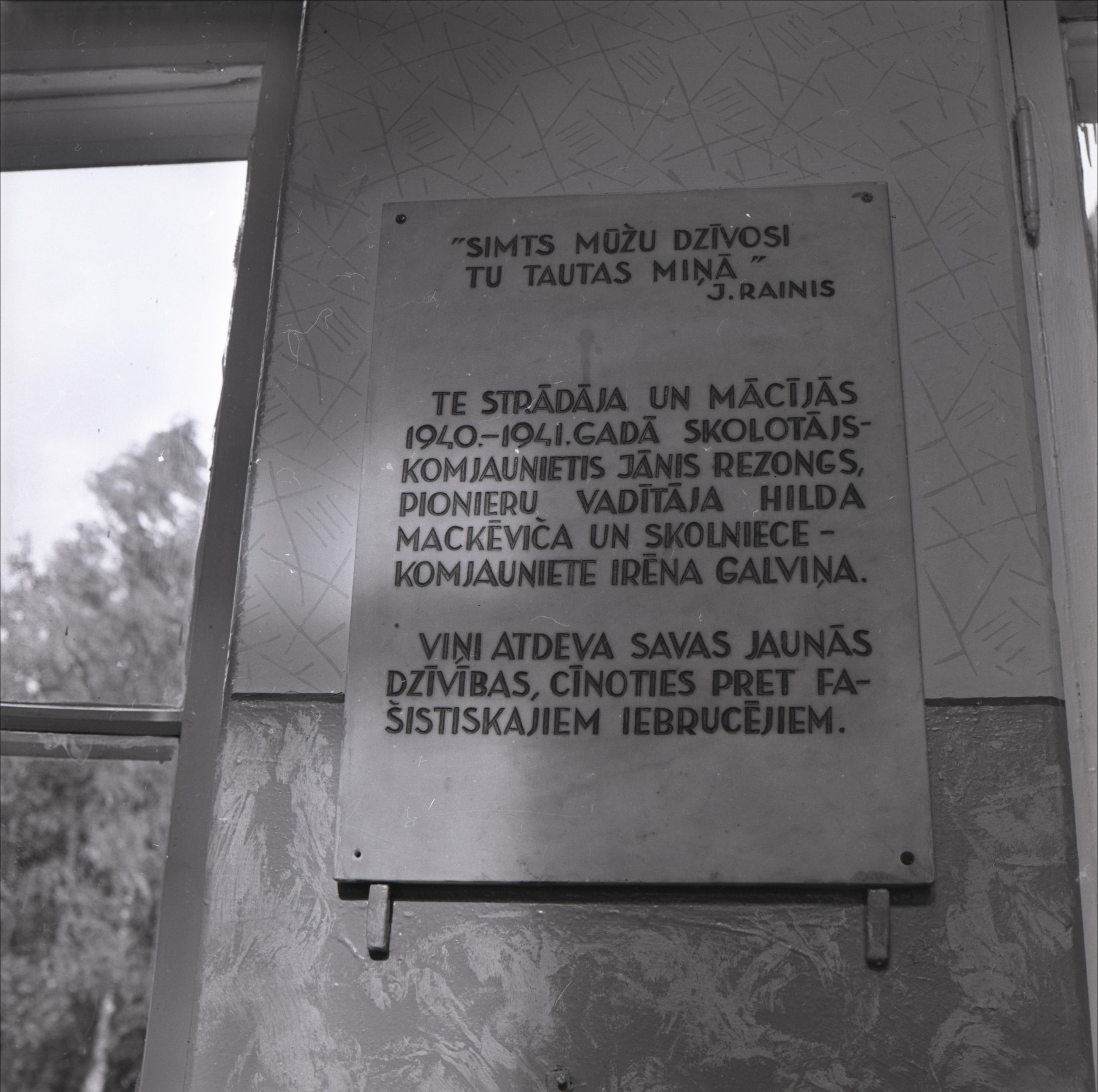 Ēka: Plāksne iekštelpās. Raiņa citāds. Informē, ka šeit strādāja un mācījās Jānis Rezongs, Hilda Makeviča un Irēna Galviņa