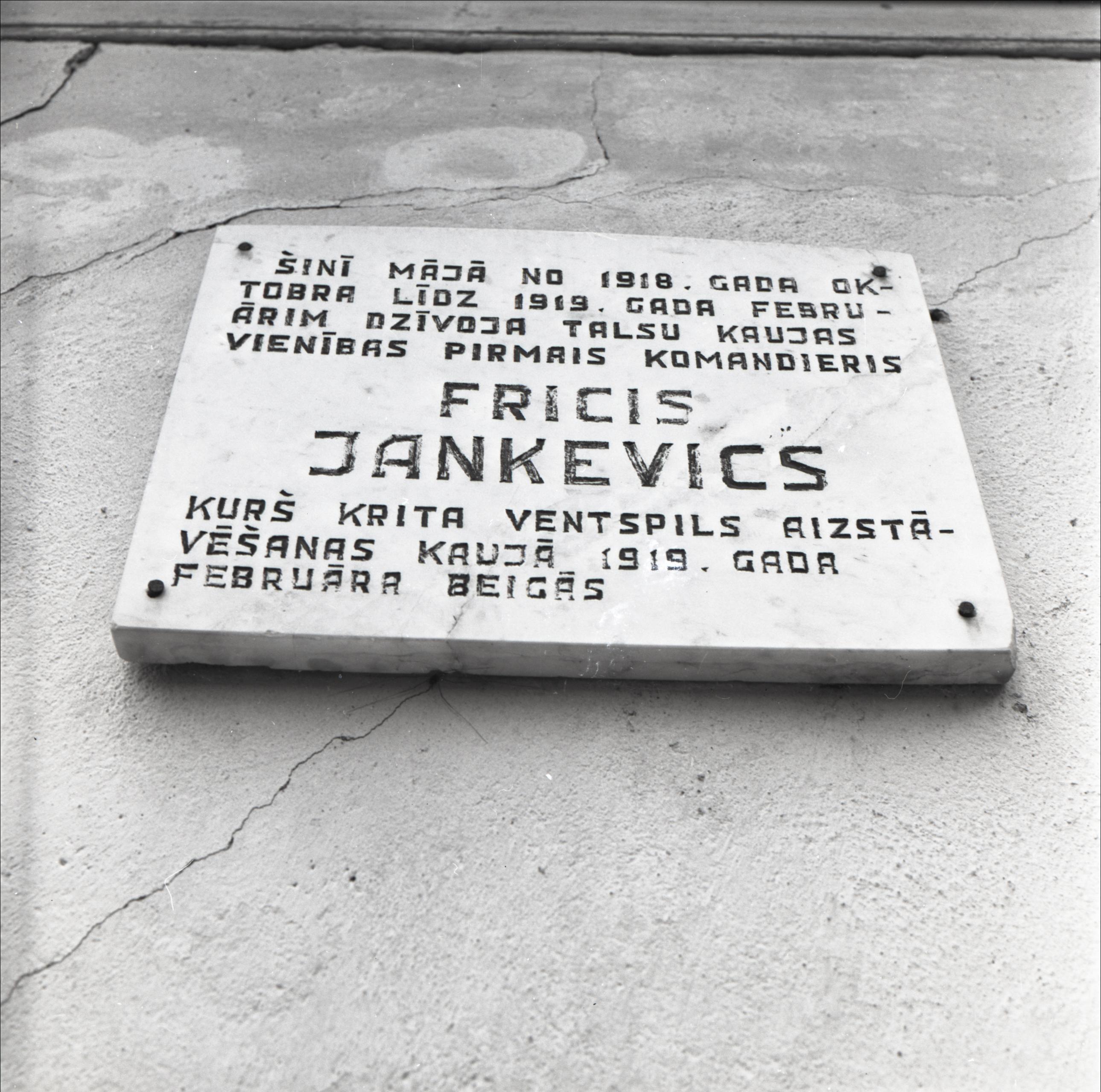 Māja, kurā 1919. gadā dzīvoja Fricis Jankevics: Plāksne. Informē, ka šajā mājā dzīvoja Fricis Jankevics