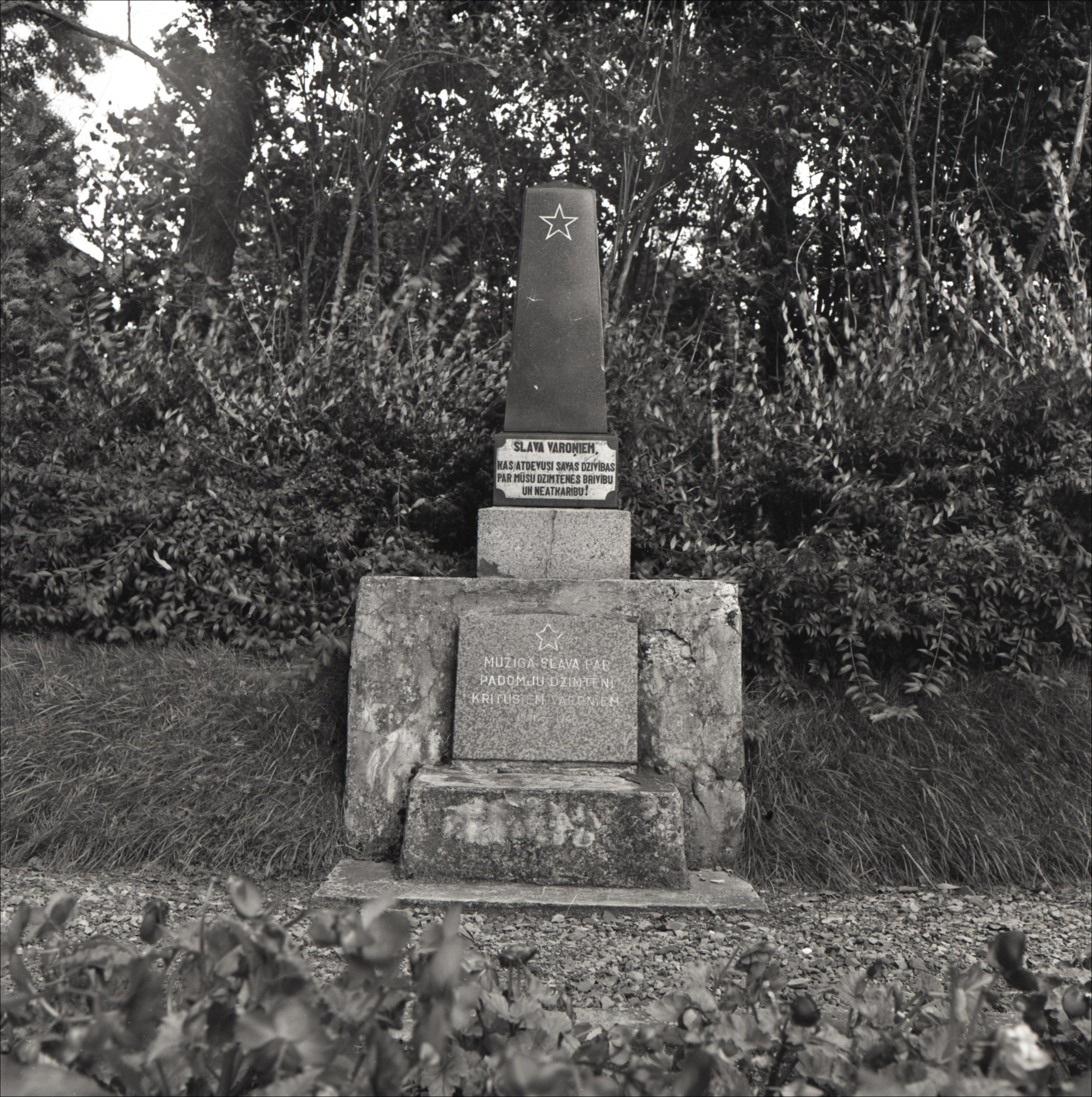2. pasaules kara kritušo kapi: Obelisks, iegravētas divas zvaigznes un uzraksti latviešu valodā, fonā krūmi