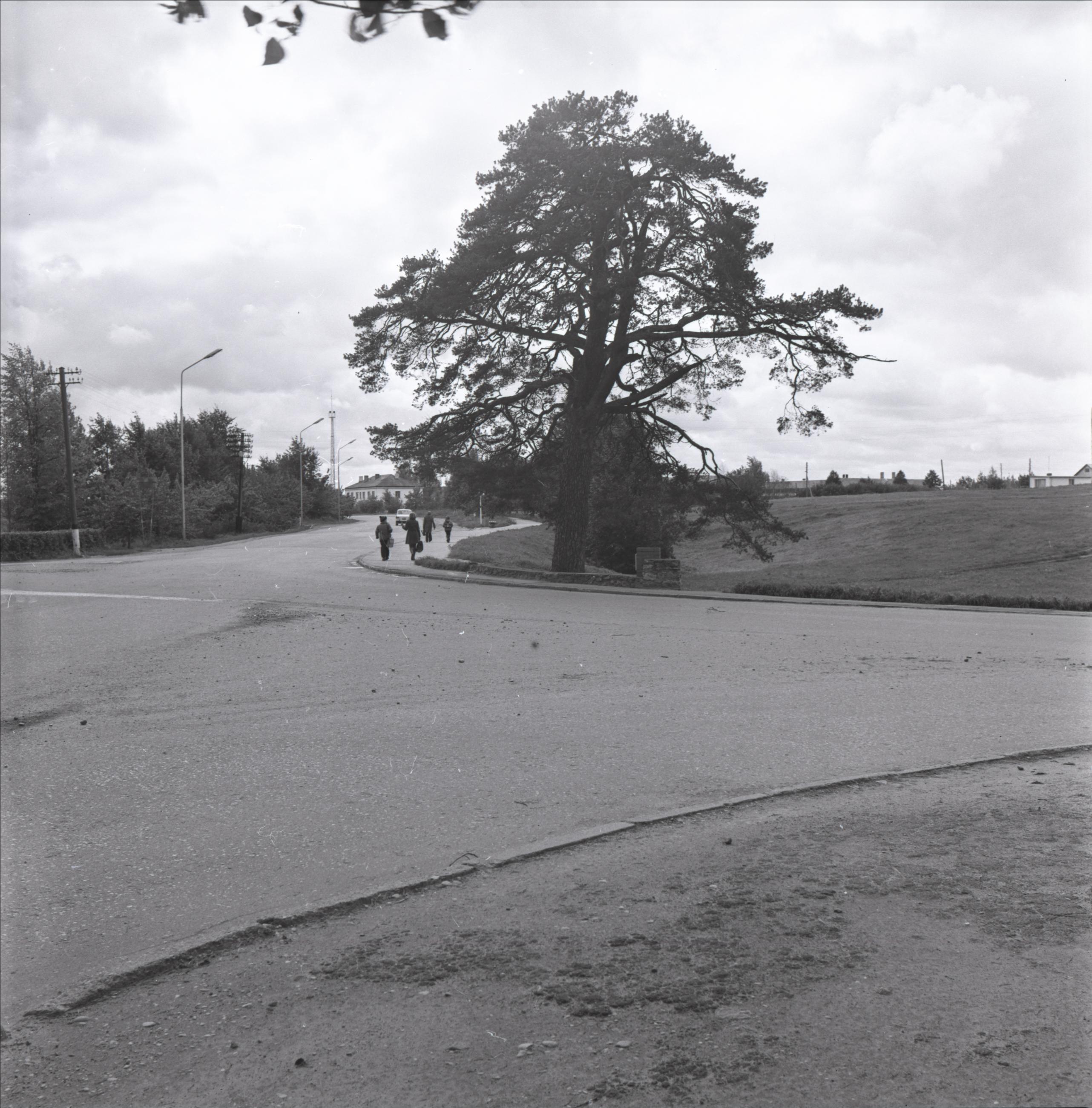 Soda priede: Priede, piemiņas plāksne, ielu krustojums, uz ietves pārvietojass četri cilvēki