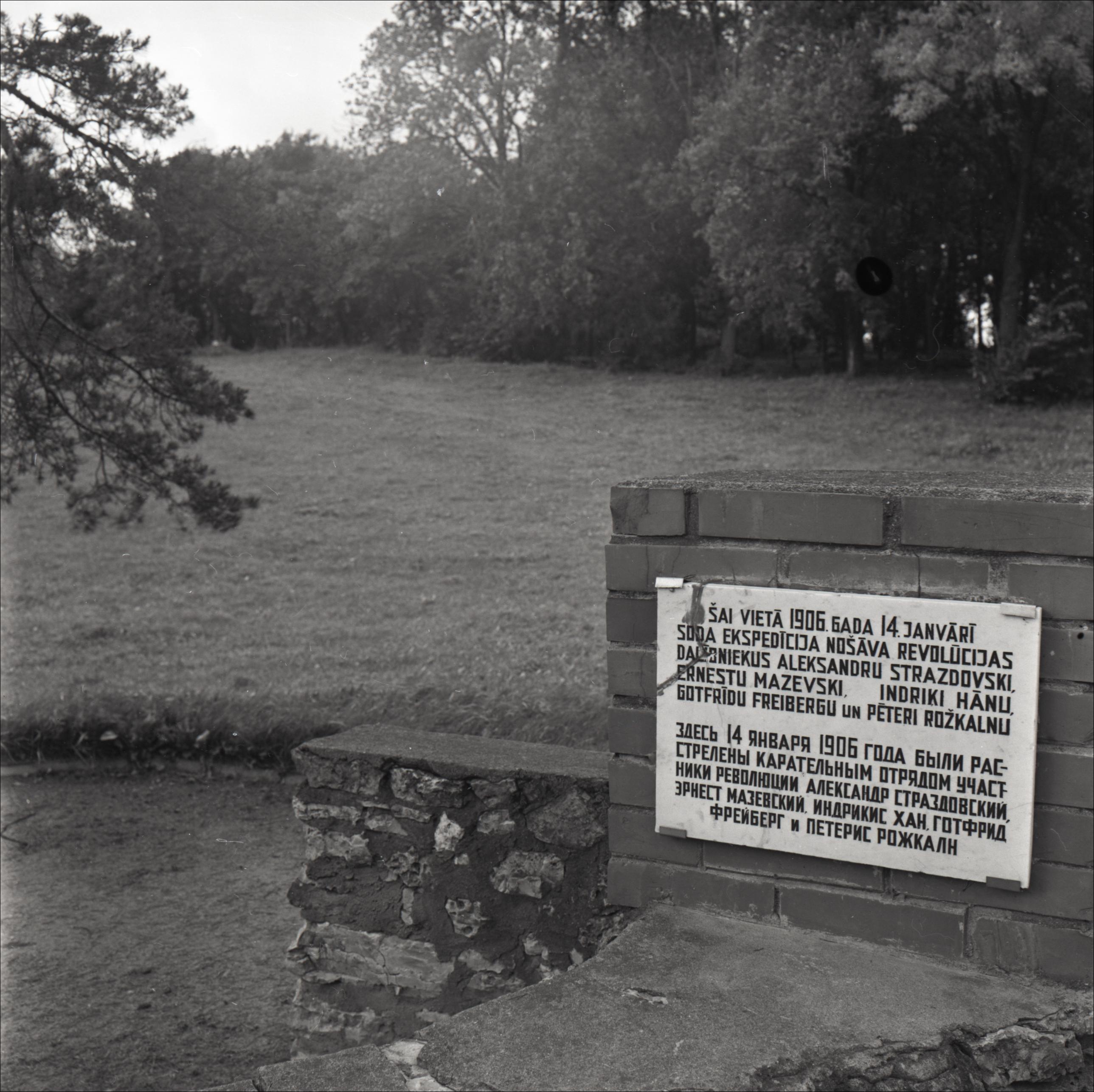 Soda priede: Plāksne novietota uz ķieģeļu sienas, fonā koki