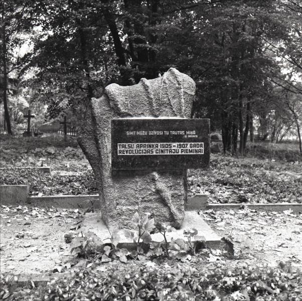 Piemiņas akmens 1905. gada revolucionāriem: Akmens, centrā plāksne ar uzrakstu latviešu valodā. Fonā koki, kapa vietas, apstādījumi