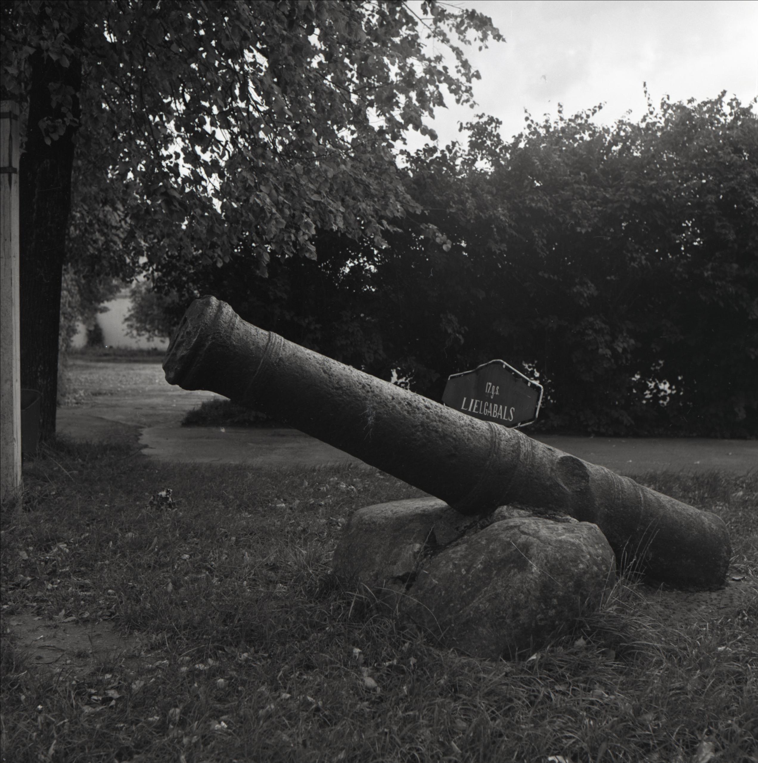 17. gs. lielgabals pie kino: Lielgabals un akmens pamata, aiz tā norāde ar uzrakstu "17 gs. lielgabals". Fonā koki, krūmi