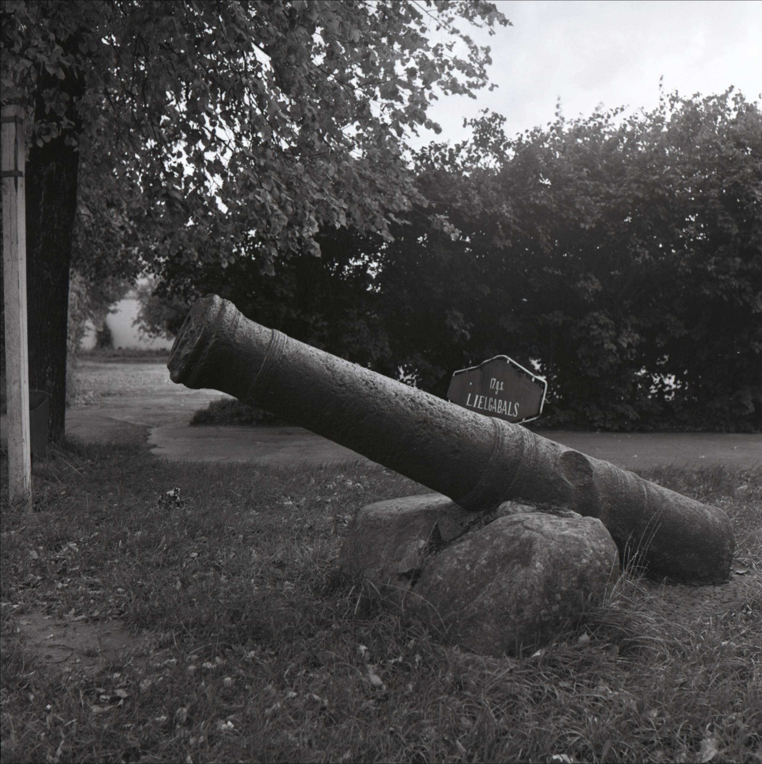 17. gs. lielgabals pie kino: Lielgabals un akmens pamata, aiz tā norāde ar uzrakstu "17 gs. lielgabals". Fonā koki, krūmi